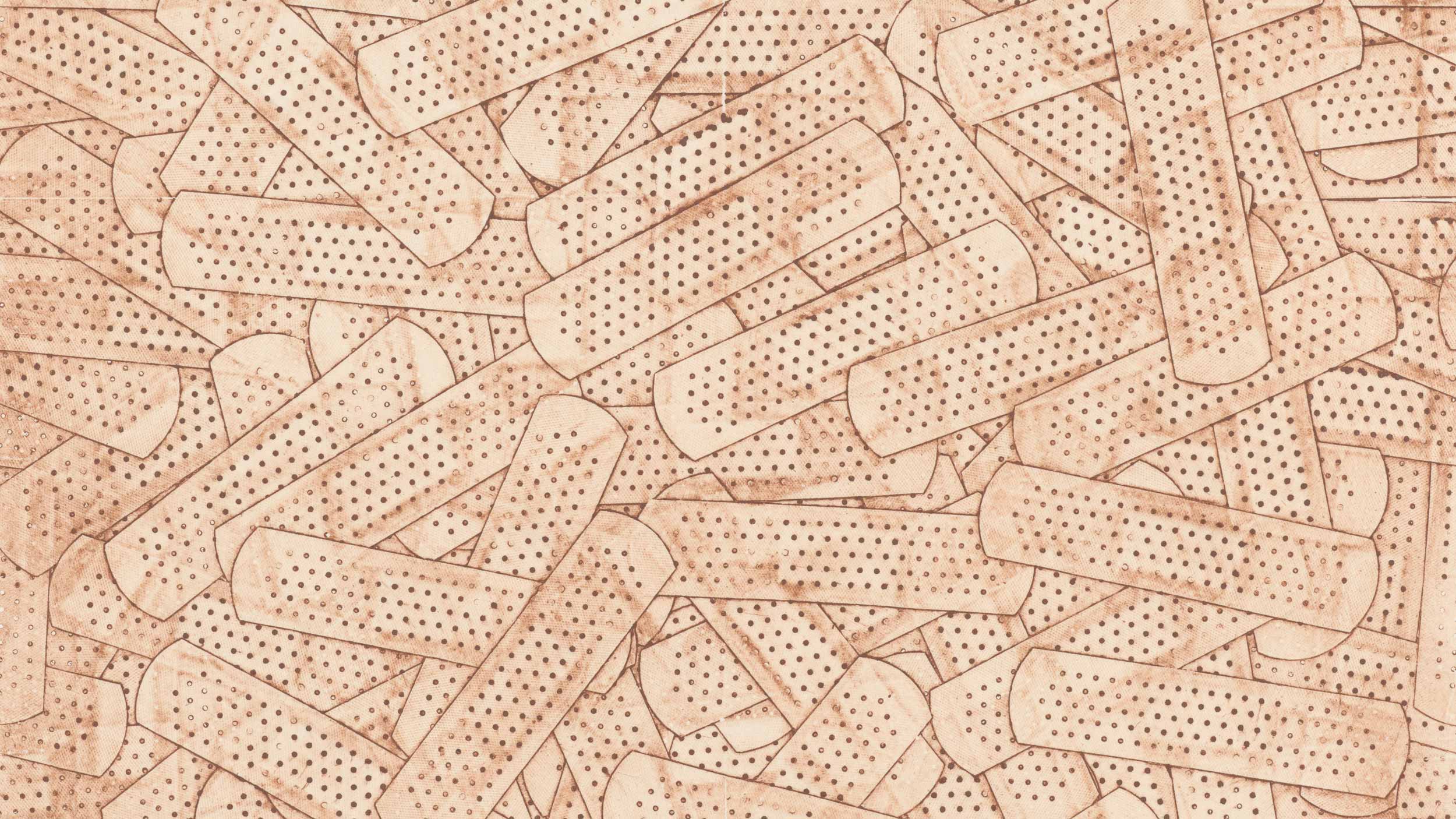 Hamilton-based artist Andrew McPhail utilizes his artistic practice to express reflections on his personal experiences through considered application of multi-media materials. His 2022 Smokestack Quarterly edition, all my little failures; the wallpaper, expands upon a life-sized wearable garment work (2010) made up of approximately 70,000 Bandaids, presented for viewing in a gallery setting and activated as a worn garment for related street performances. Like the original piece, this print was created by direct incorporation of Bandaids as they were layered, inked, and imprinted directly onto paper through the press. Though each unique print in the edition is intended for individual distribution, the repeated pattern carried through the edition cumulatively creates one single, contiguous image. As Andrew further describes: