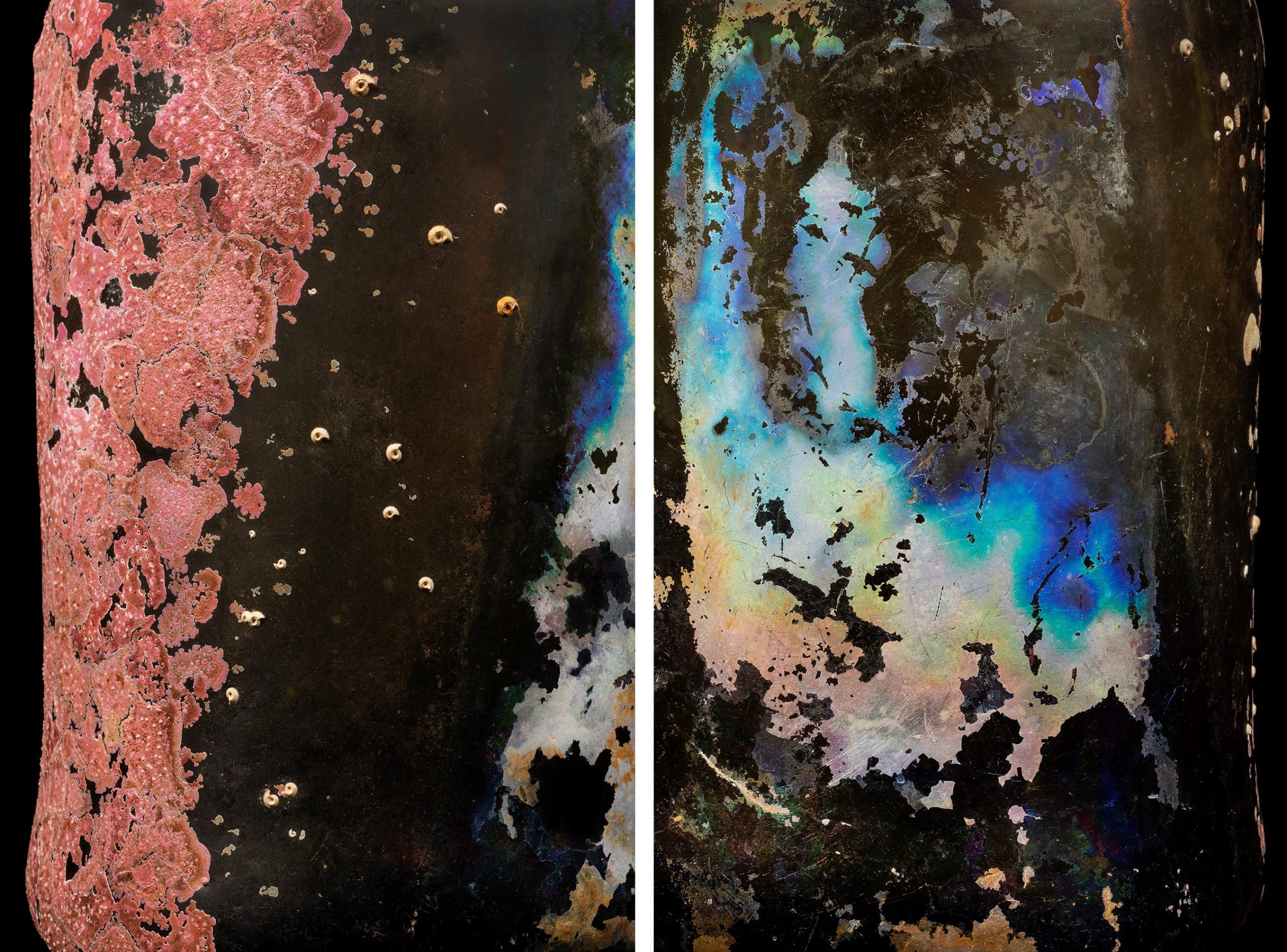 The Vessels: Undertone works included in Chris Myhr’s exhibition, Vessels & Suspensions, were printed in the Smokestack Digital studio and mounted by Smokestack Presentation. These diptych pieces detail the surprising colouration and surface marks naturally created by the prolonged effects of time and the additive/subtractive processes occurring on the seafloor beneath the shipping lanes of Halifax Harbour (Nova Scotia).