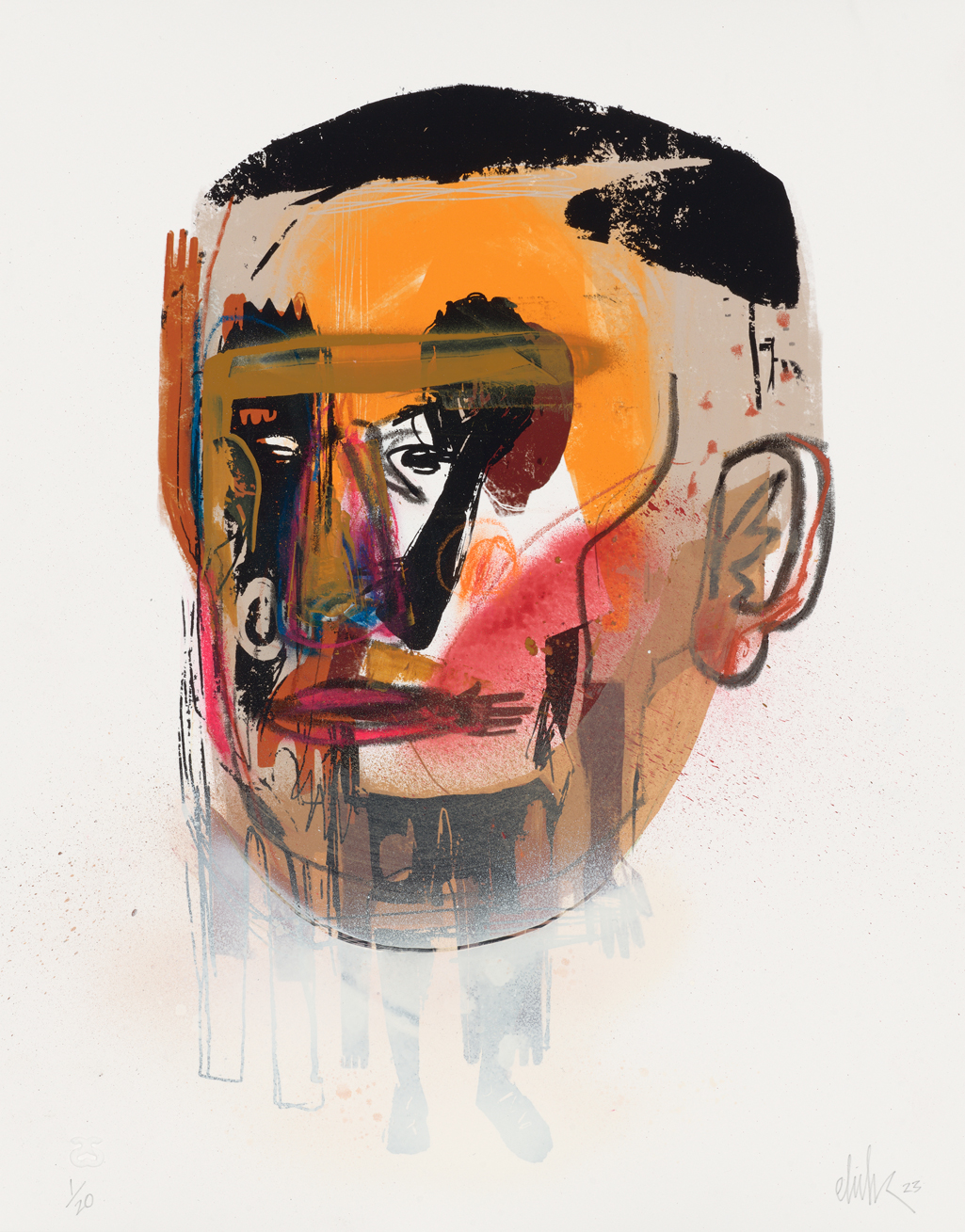 Slumbers Cousin, 4th Removed integrates analog and digital printmaking processes with added spray-painted and hand-drawn elements. Each independent work in the edition builds off a single image base, which Elliott then intuitively responded to with distinct additions of uniquely layered marks, text, and imagery – a truly variable edition.