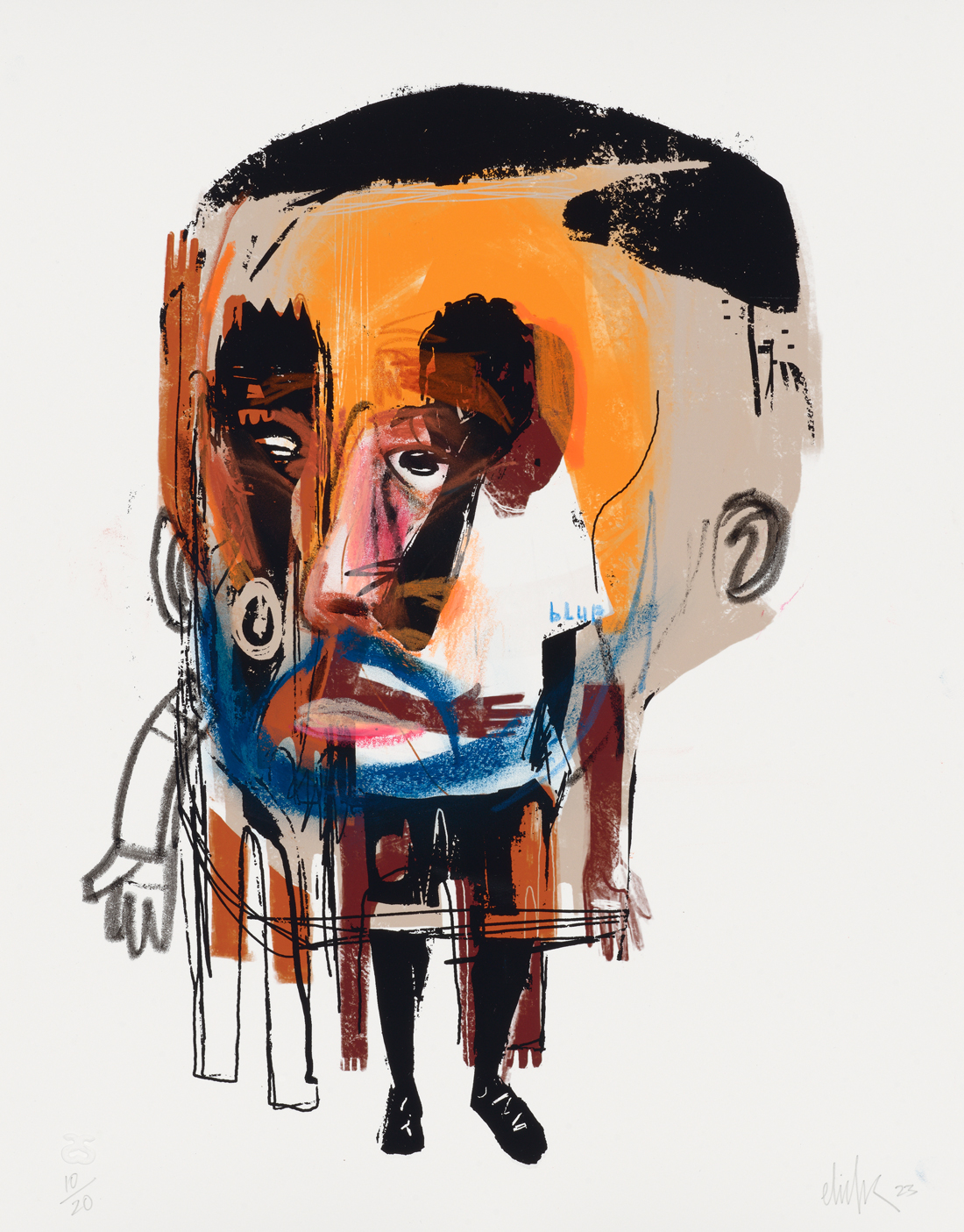 Slumbers Cousin, 4th Removed integrates analog and digital printmaking processes with added spray-painted and hand-drawn elements. Each independent work in the edition builds off a single image base, which Elliott then intuitively responded to with distinct additions of uniquely layered marks, text, and imagery – a truly variable edition.