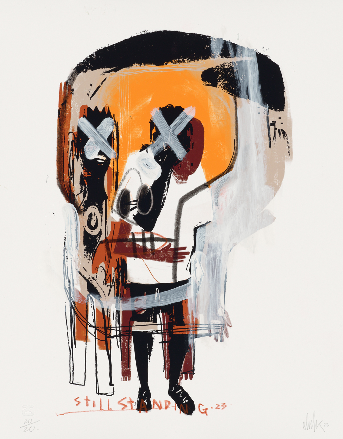 Slumbers Cousin, 4th Removed integrates analog and digital printmaking processes with added spray-painted and hand-drawn elements. Each independent work in the edition builds off a single image base, which Elliott then intuitively responded to with distinct additions of uniquely layered marks, text, and imagery – a truly variable edition.