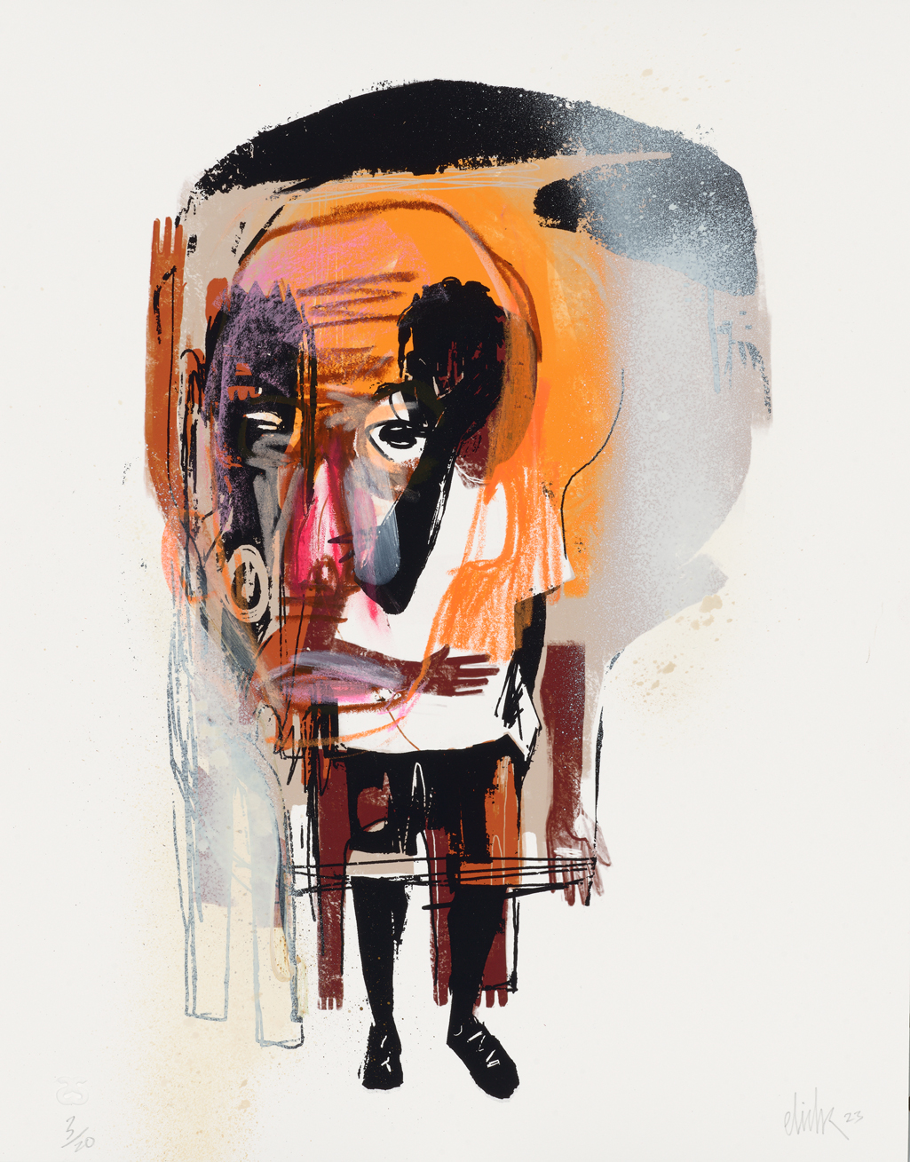 Slumbers Cousin, 4th Removed integrates analog and digital printmaking processes with added spray-painted and hand-drawn elements. Each independent work in the edition builds off a single image base, which Elliott then intuitively responded to with distinct additions of uniquely layered marks, text, and imagery – a truly variable edition.
