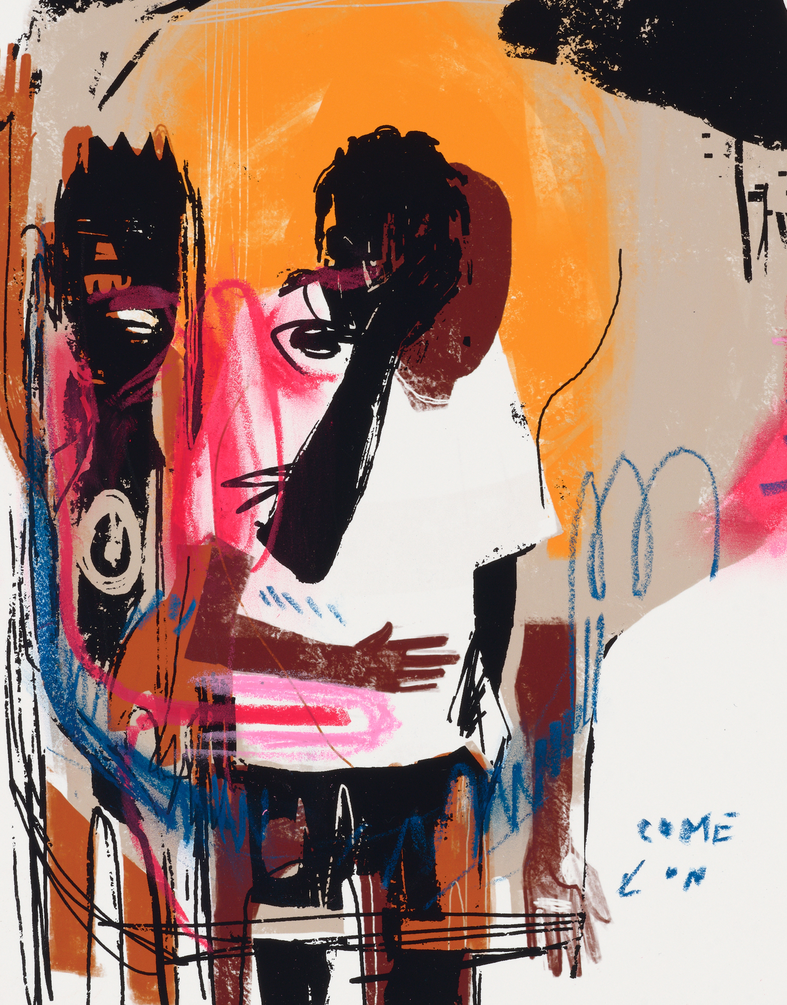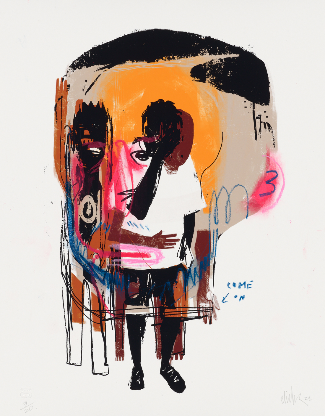 Slumbers Cousin, 4th Removed integrates analog and digital printmaking processes with added spray-painted and hand-drawn elements. Each independent work in the edition builds off a single image base, which Elliott then intuitively responded to with distinct additions of uniquely layered marks, text, and imagery – a truly variable edition.