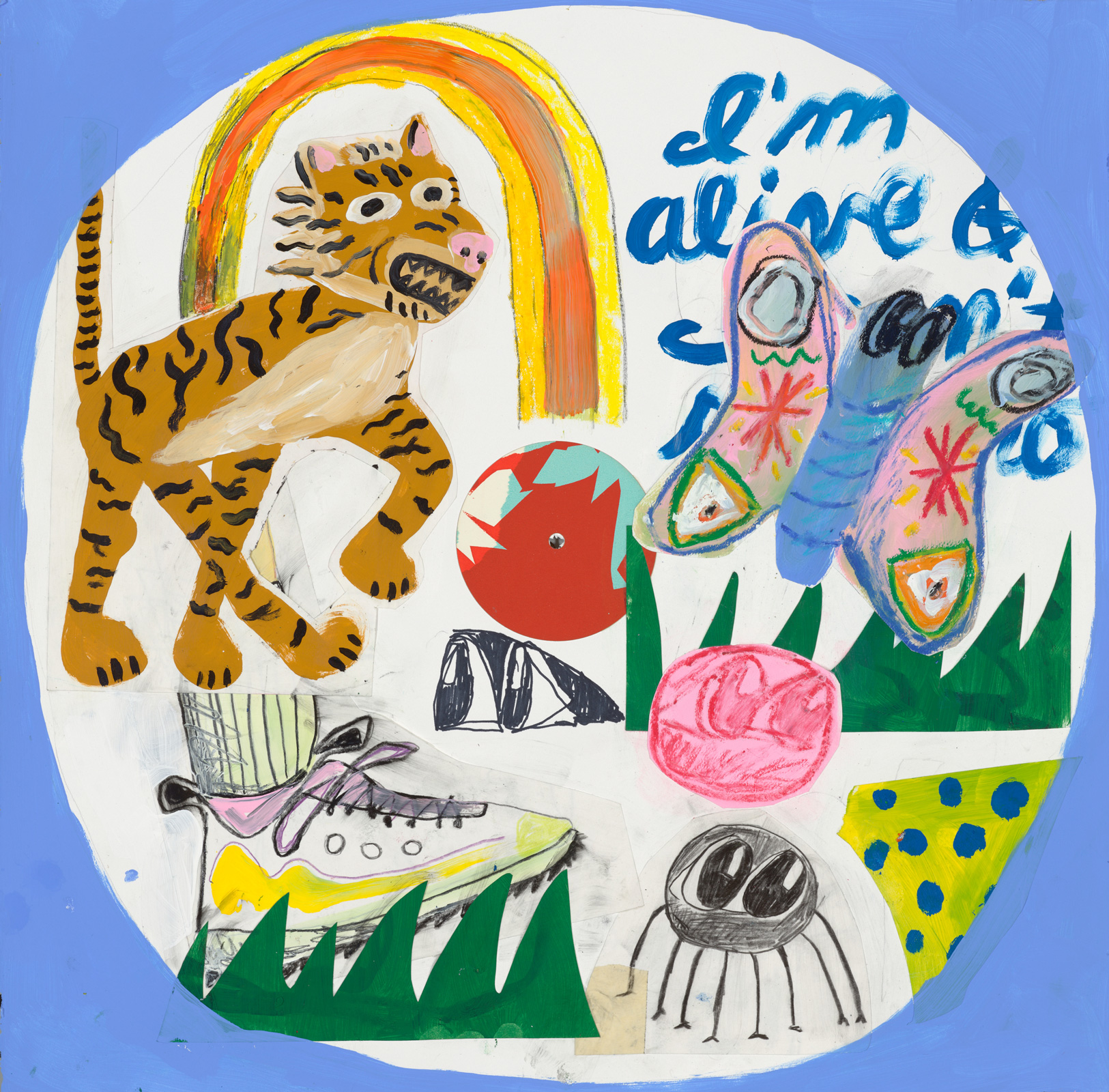 • Flashe, pencil crayon, sharpie and pastel on paper with applied silkscreen centrepiece