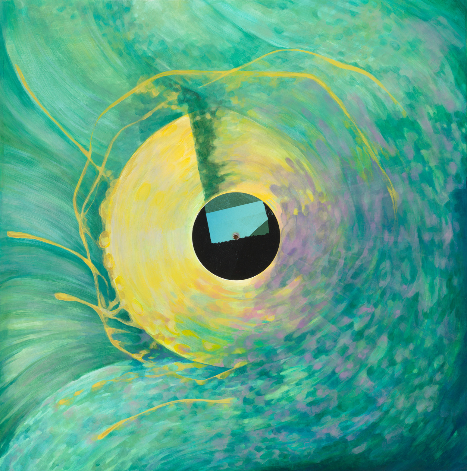 • Acrylic and pencil crayon on paper with applied silkscreen centrepiece