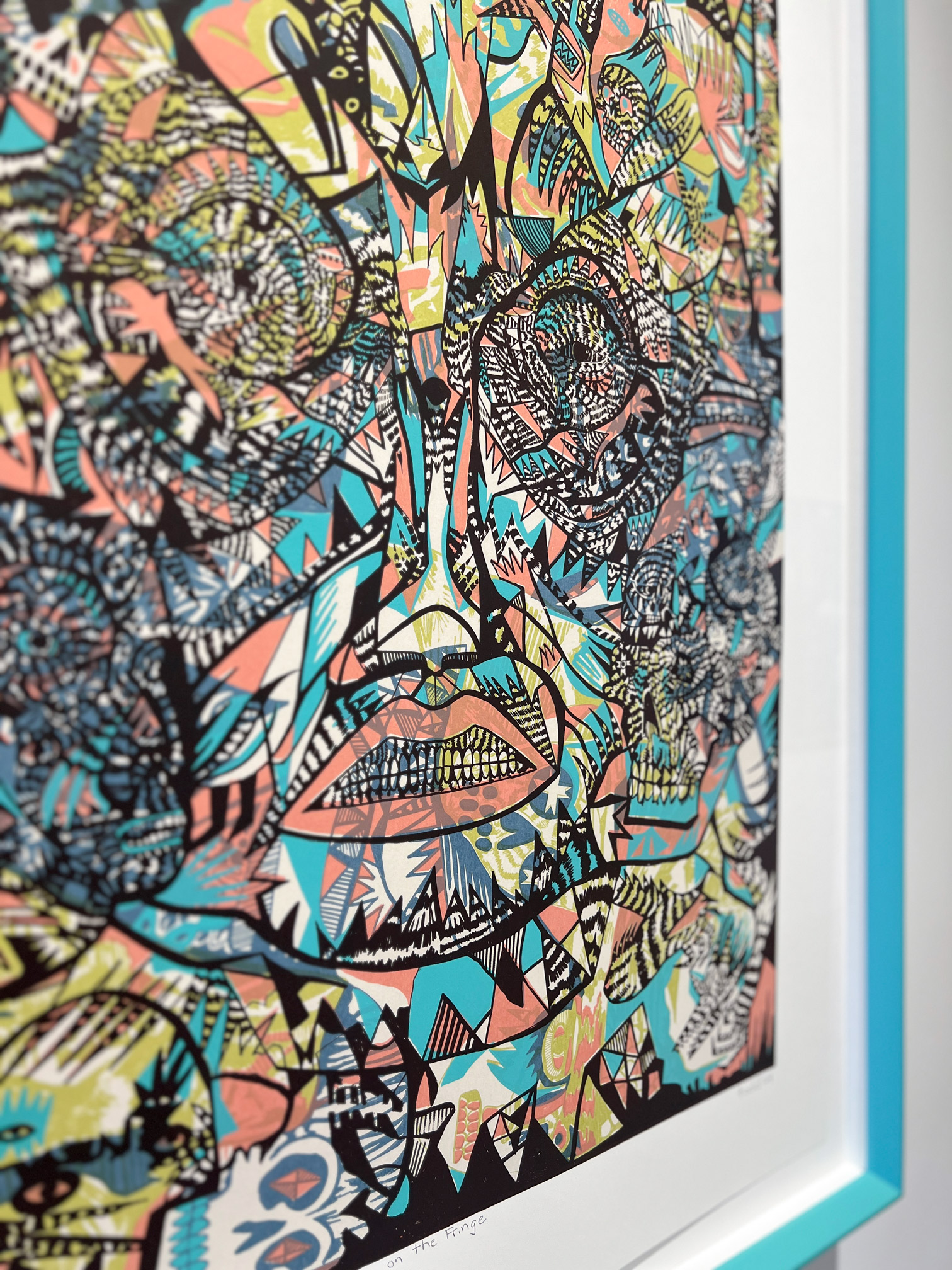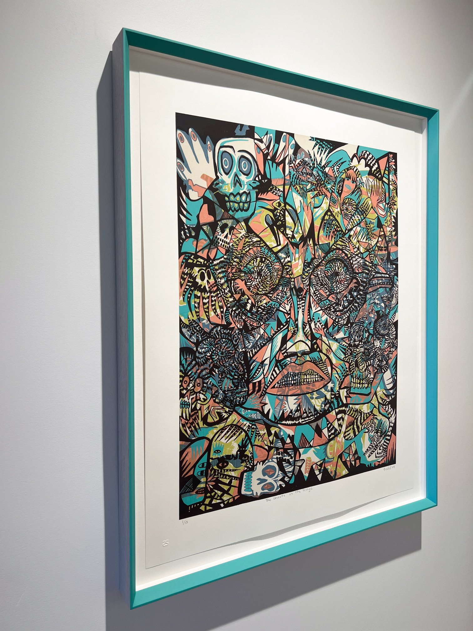 Todd’s Published Edition, The Ghosts on the Fringe, expands on his distinctive visual vocabulary, revealing a meticulously-detailed collection of symbolic images and patterns merged layer-by-layer through the process of silkscreen print. With collaborative support from Smokestack’s analog printmaker, Laine Groeneweg, Todd’s imagery was assembled using 7 distinct layers of shape and colour that brought this new, richly narrative portrait to life. A custom frame by Superframe presents a vibrant finishing.