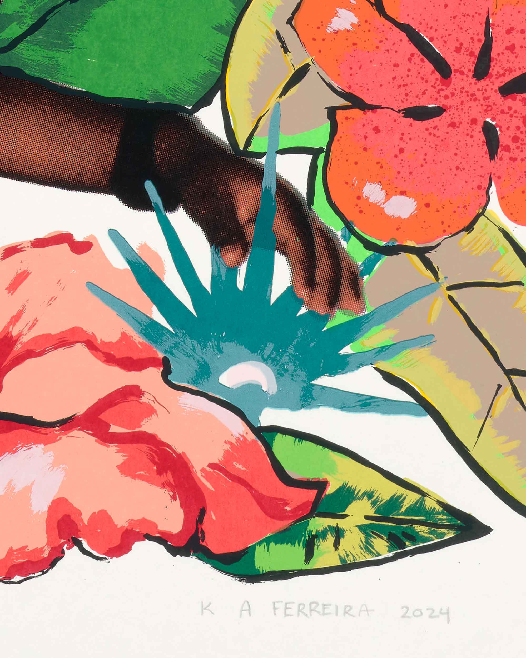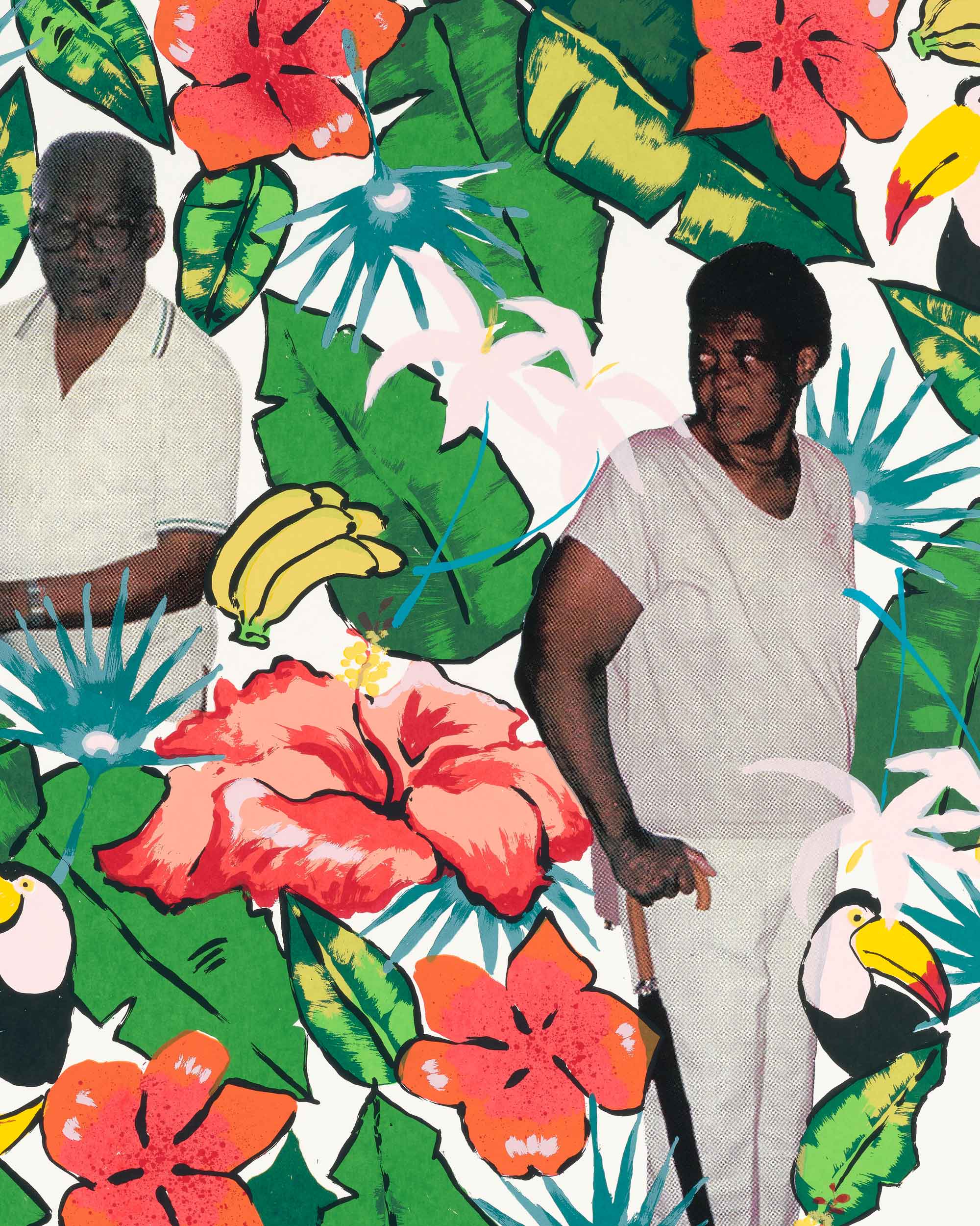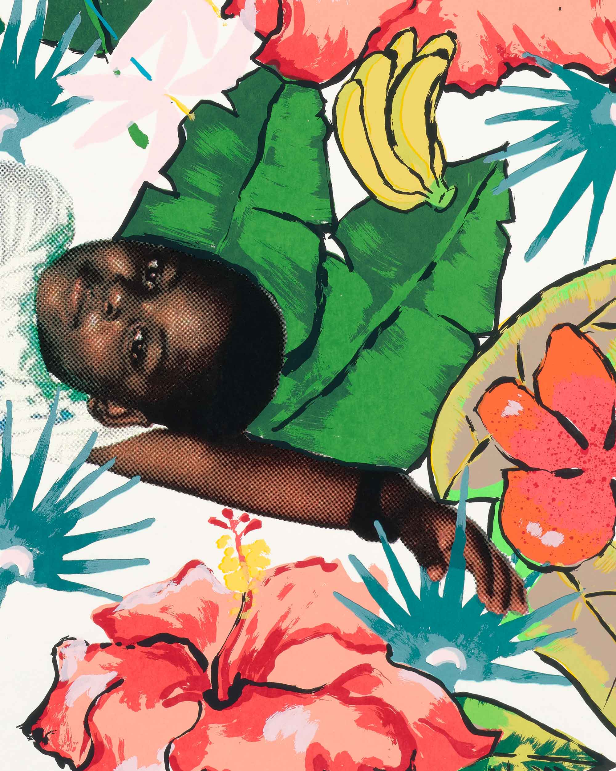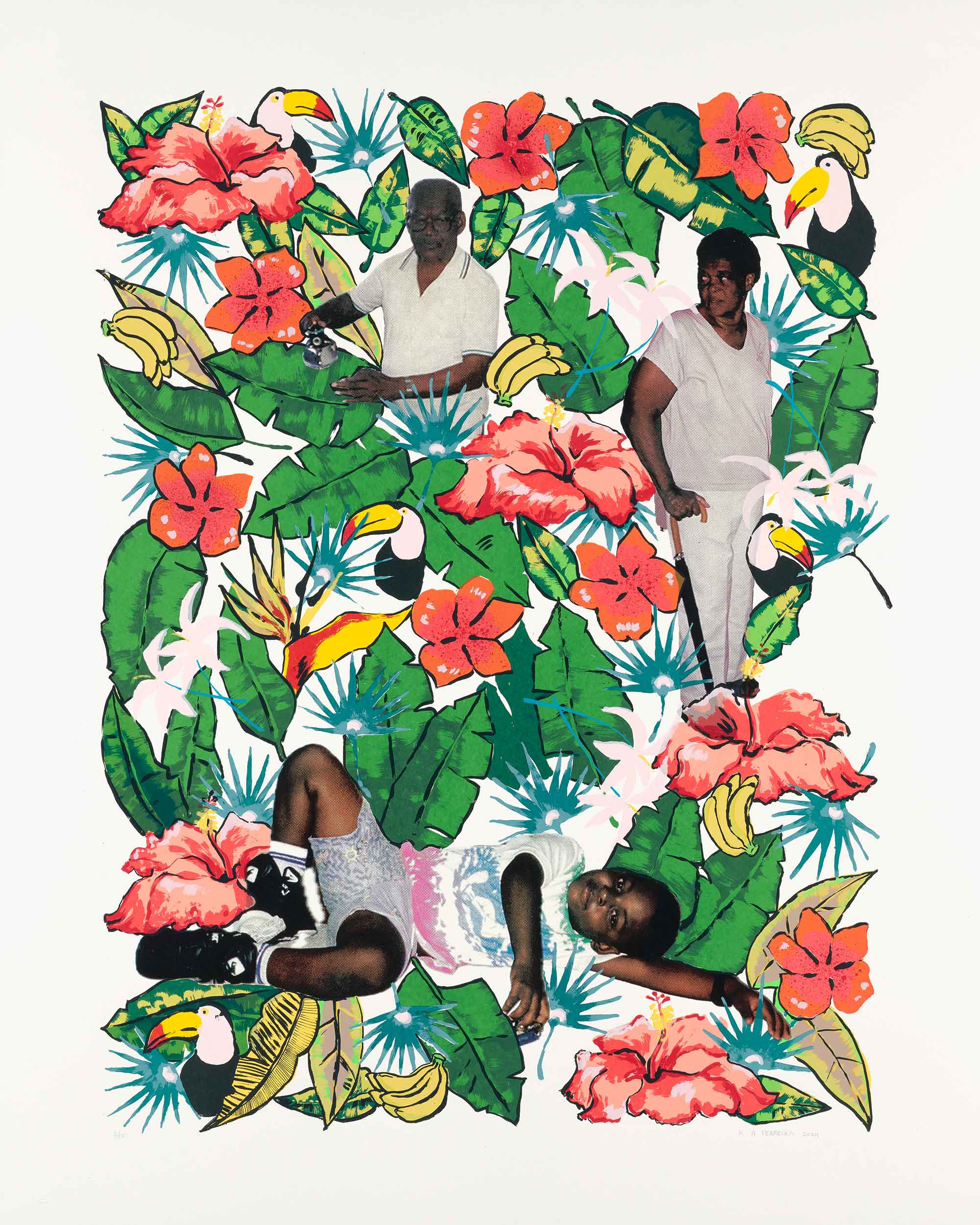 Kareem-Anthony Ferreira explores experiences of cultural divergence and family history. Informed by his experience as a first-born Canadian with strong ties to his Trinidadian roots, Ferreira’s black portraiture investigates patterns of intersecting personal, familial and social identities. In My Grandparent’s Yard further expands on Ferreira’s practice through his use of family photographs as the narrative foundation for imagery expressed in printmaking. In this large silkscreen print, photographs of his family members are integrated amongst an abundance of vibrant natural elements. The work demonstrates a variety of silkscreen methods engaged – from CMYK half-tone processes to hand-painted films – to share a (21) layered re-imagining of verdant family memories.