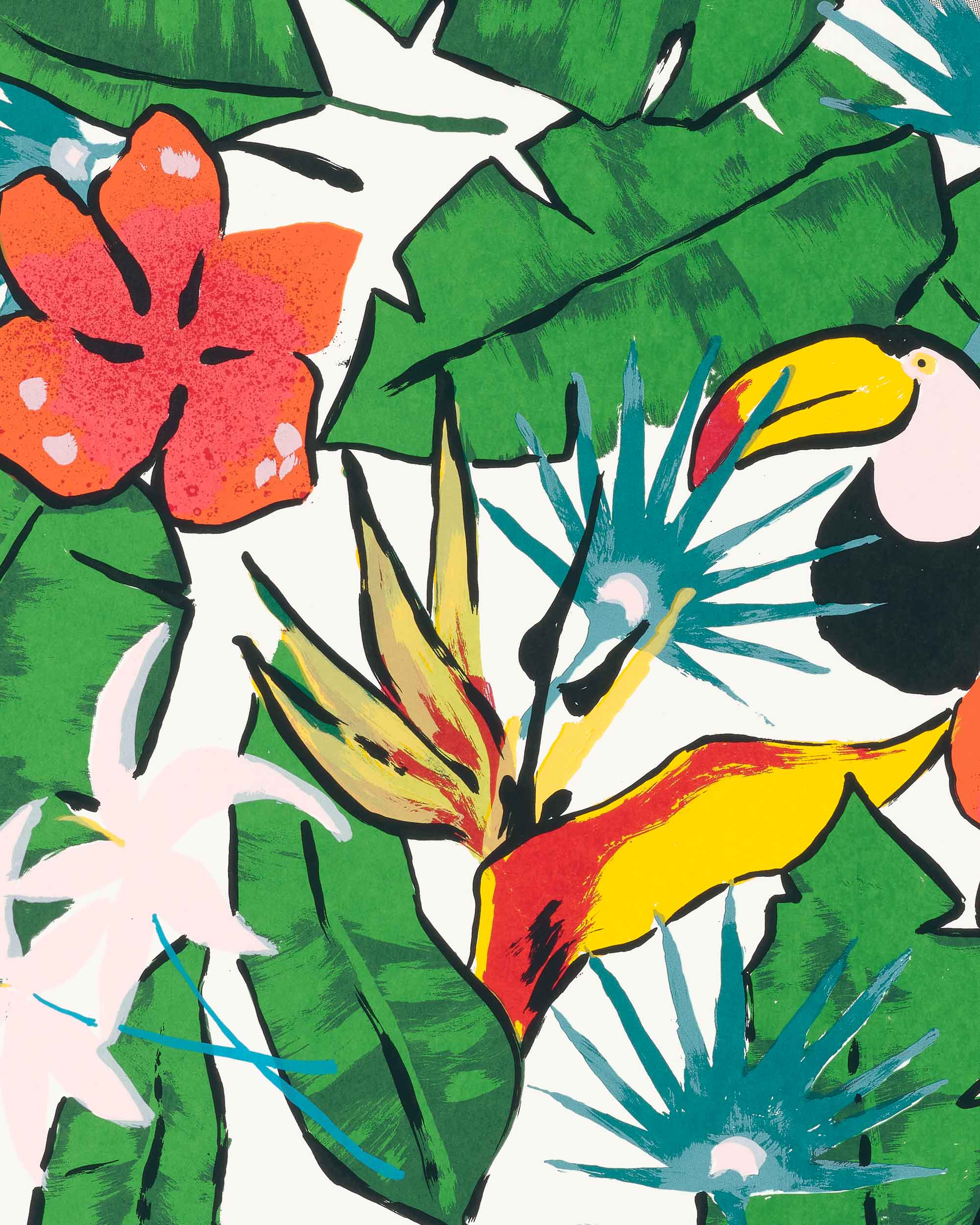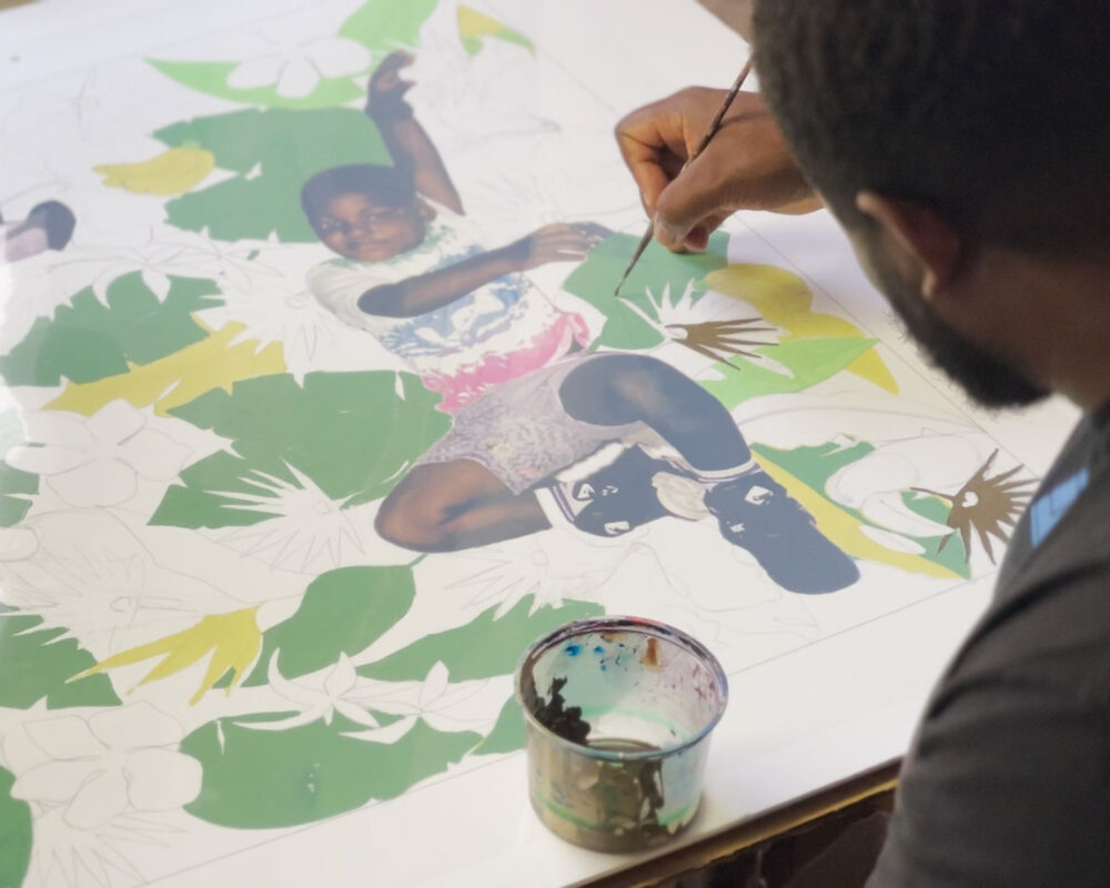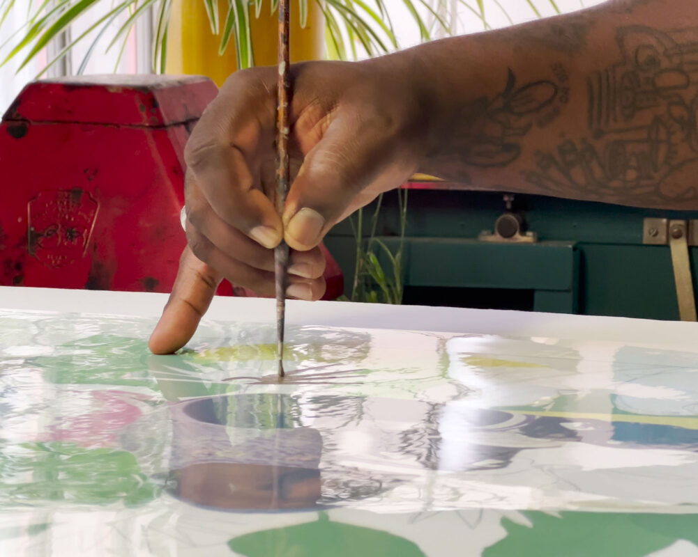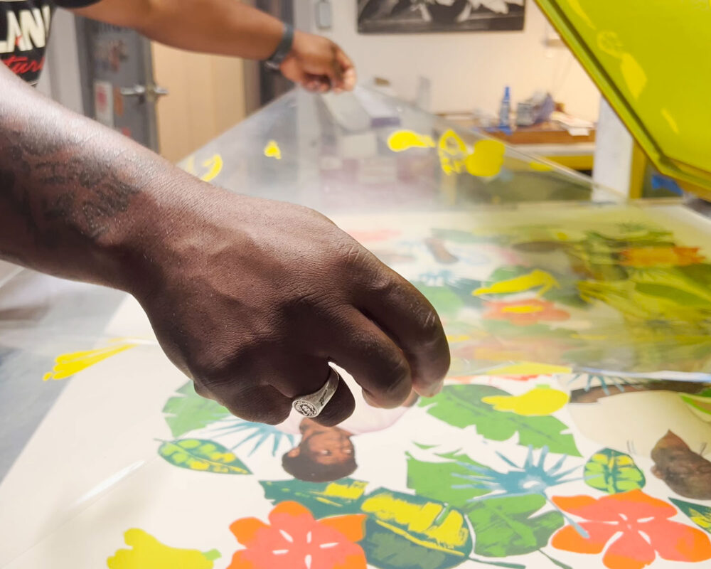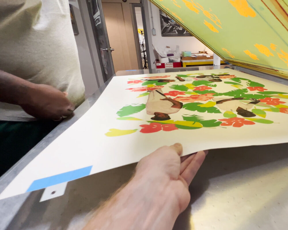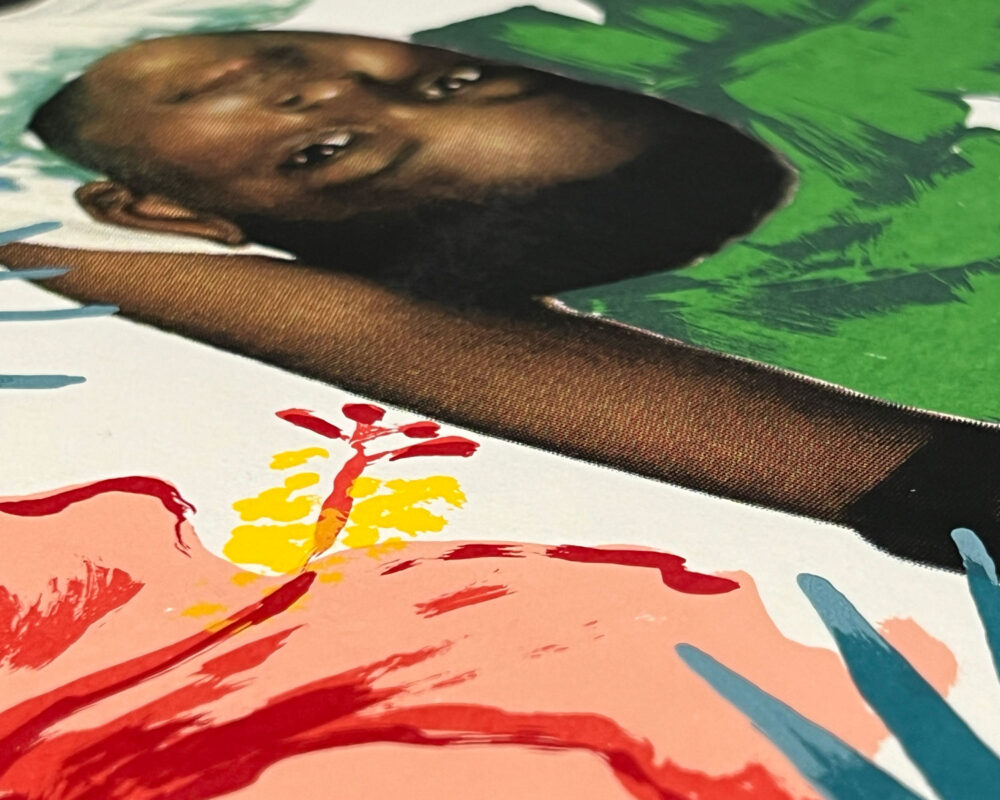 Kareem-Anthony Ferreira explores experiences of cultural divergence and family history. Informed by his experience as a first-born Canadian with strong ties to his Trinidadian roots, Ferreira’s black portraiture investigates patterns of intersecting personal, familial and social identities. In My Grandparent’s Yard further expands on Ferreira’s practice through his use of family photographs as the narrative foundation for imagery expressed in printmaking. In this large silkscreen print, photographs of his family members are integrated amongst an abundance of vibrant natural elements. The work demonstrates a variety of silkscreen methods engaged – from CMYK half-tone processes to hand-painted films – to share a (21) layered re-imagining of verdant family memories.