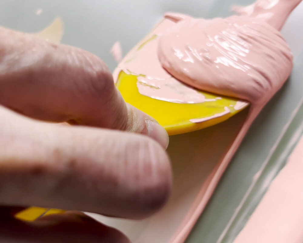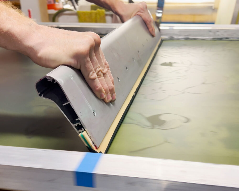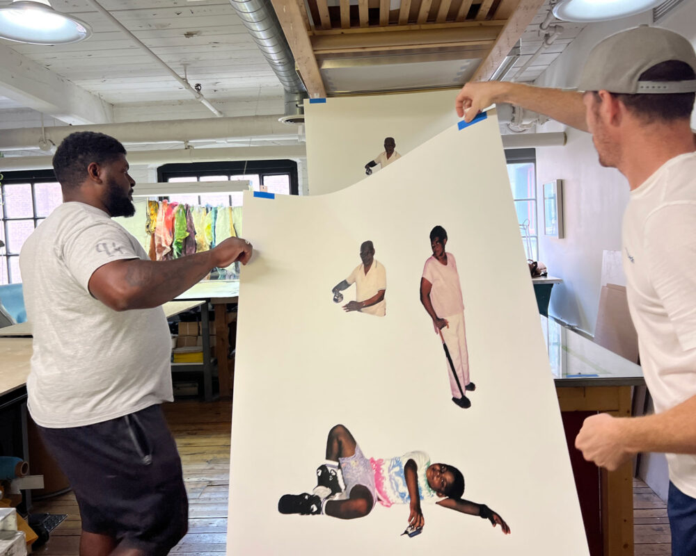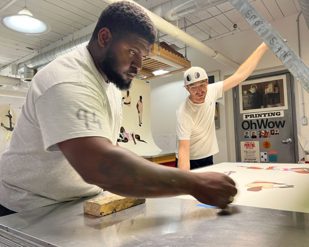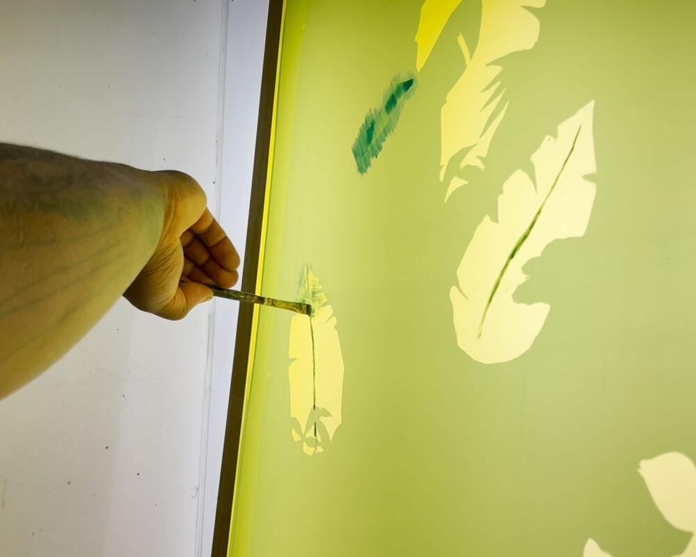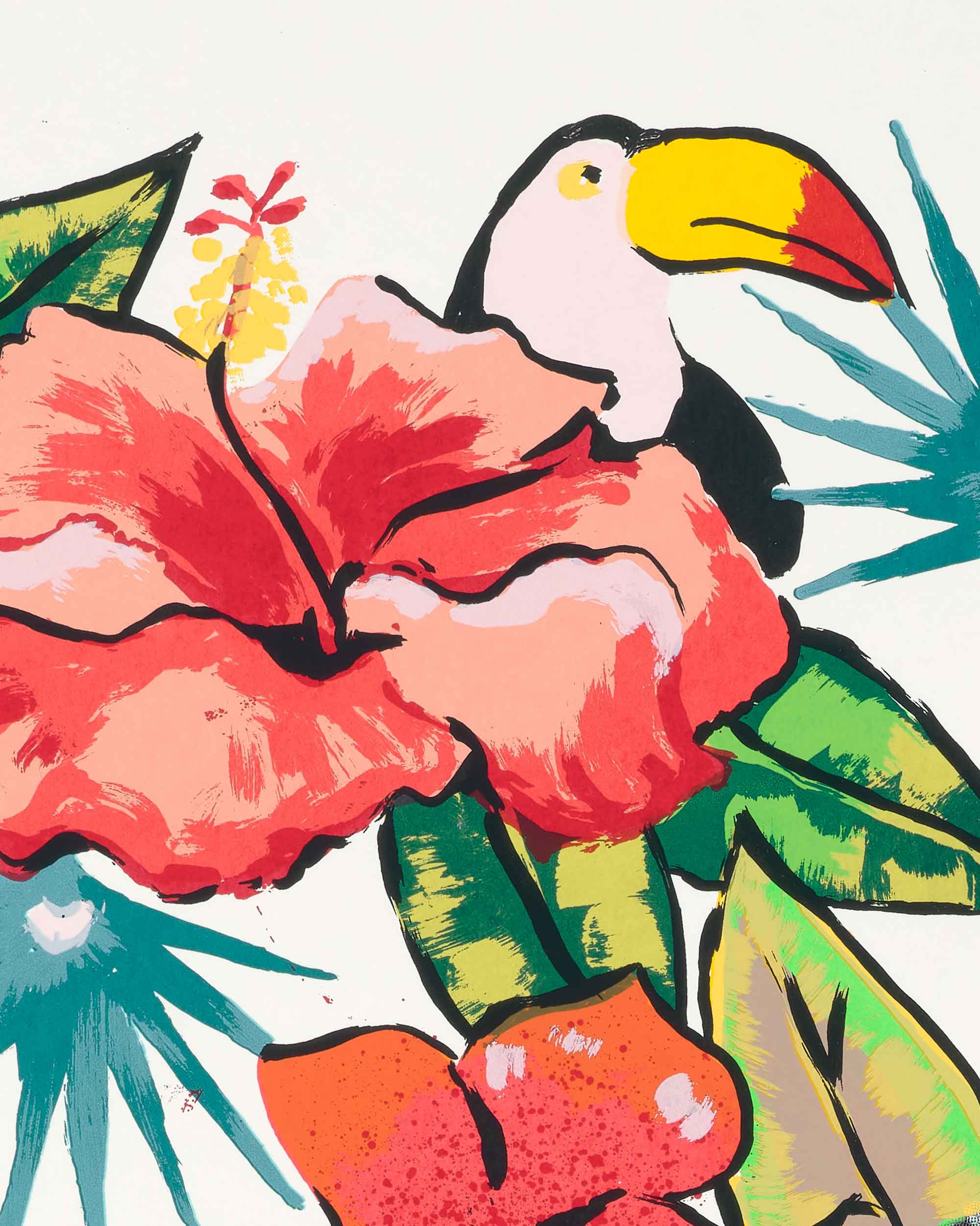 Kareem-Anthony Ferreira explores experiences of cultural divergence and family history. Informed by his experience as a first-born Canadian with strong ties to his Trinidadian roots, Ferreira’s black portraiture investigates patterns of intersecting personal, familial and social identities. In My Grandparent’s Yard further expands on Ferreira’s practice through his use of family photographs as the narrative foundation for imagery expressed in printmaking. In this large silkscreen print, photographs of his family members are integrated amongst an abundance of vibrant natural elements. The work demonstrates a variety of silkscreen methods engaged – from CMYK half-tone processes to hand-painted films – to share a (21) layered re-imagining of verdant family memories.