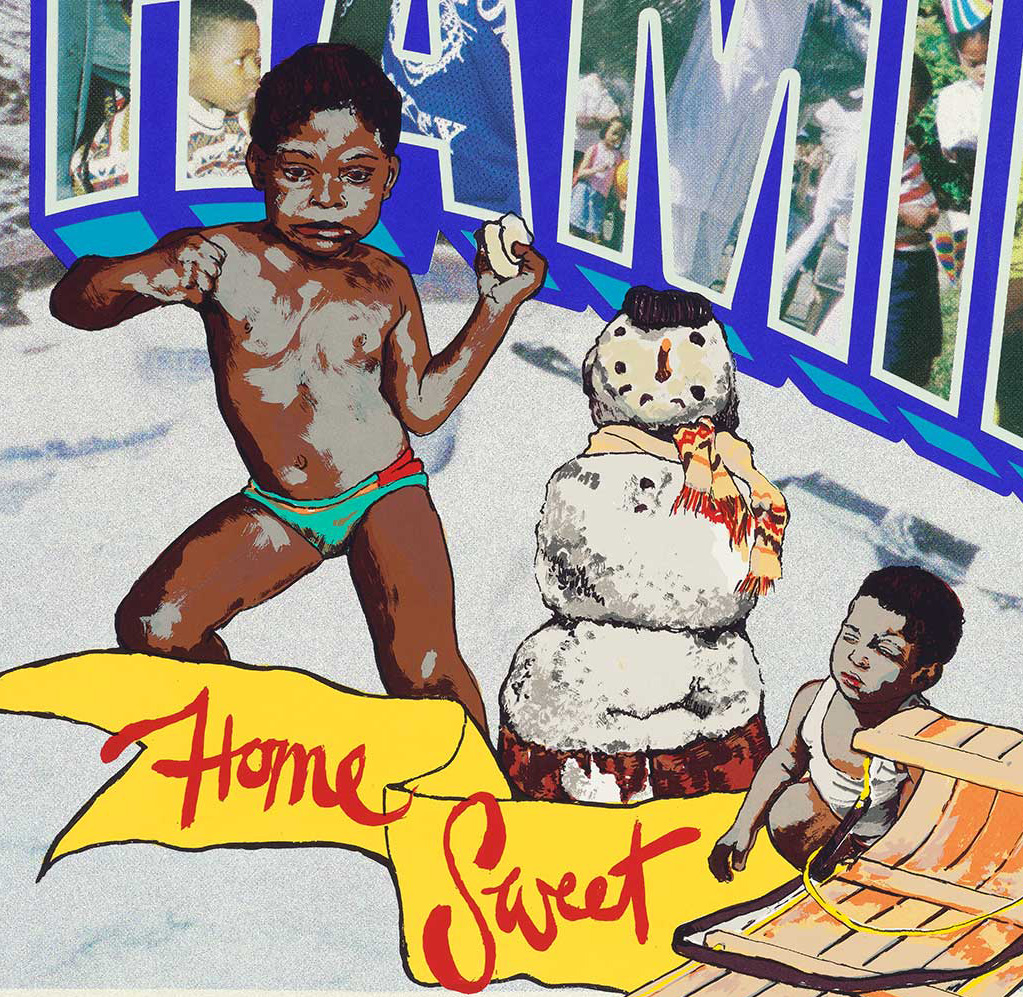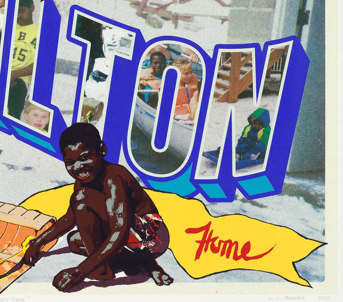 Home Sweet Home is one of Ferreira’s most recent projects in silkscreen printing. With its companion piece – Home Away From Home – the prints reflect his impressions of “home”, particularly a feeling of home informed by interconnected experiences and memories across two distinct geographical/cultural spaces. Characteristic of his process, photographs from Ferreira’s personal and family collections were drawn upon as the primary source material for development of the landscape and figurative imagery elements. Evocative of post-card designs, the works draw playful connection between Trinidad and Hamilton: the grounding locations of Ferreira’s self.