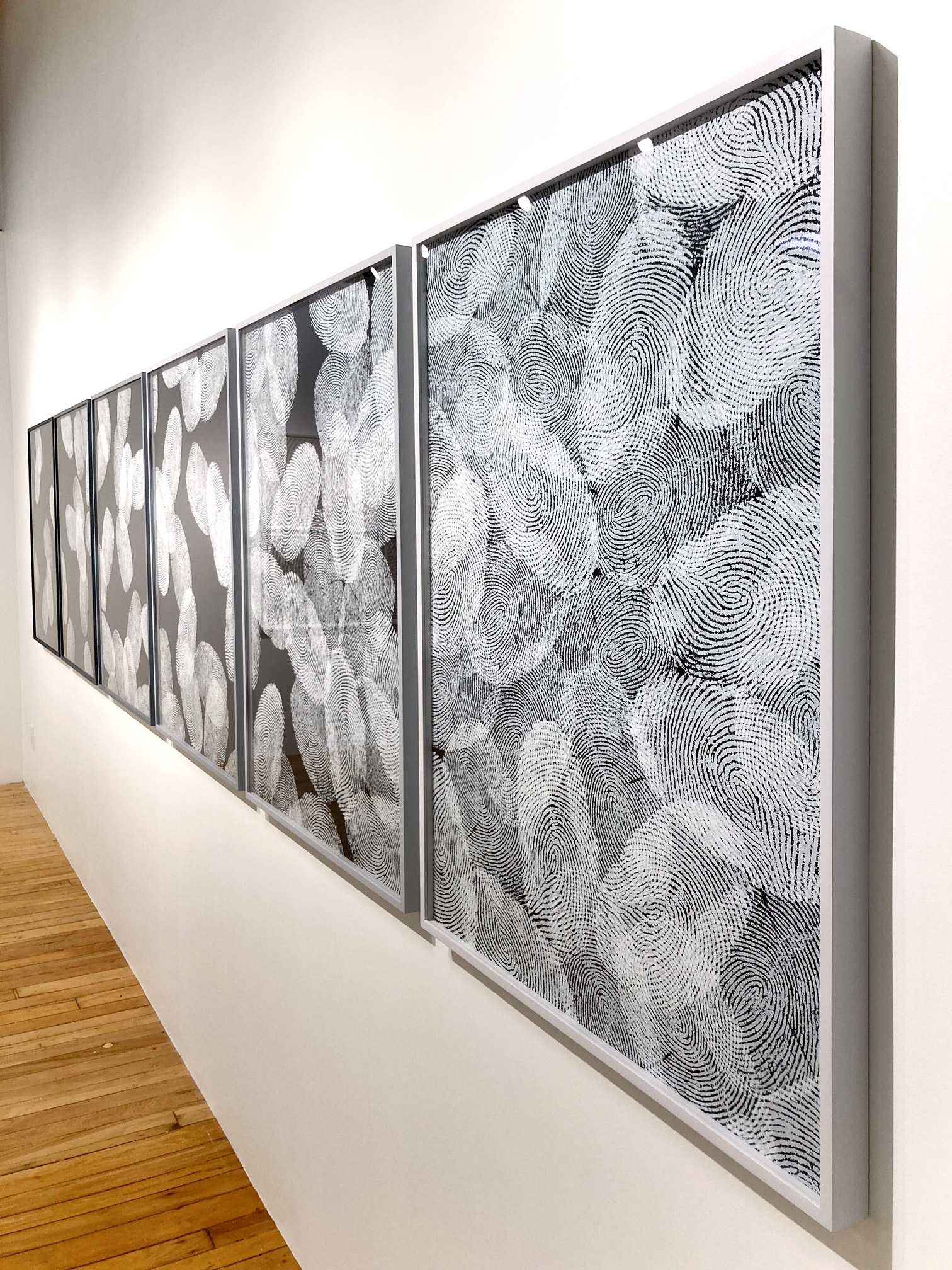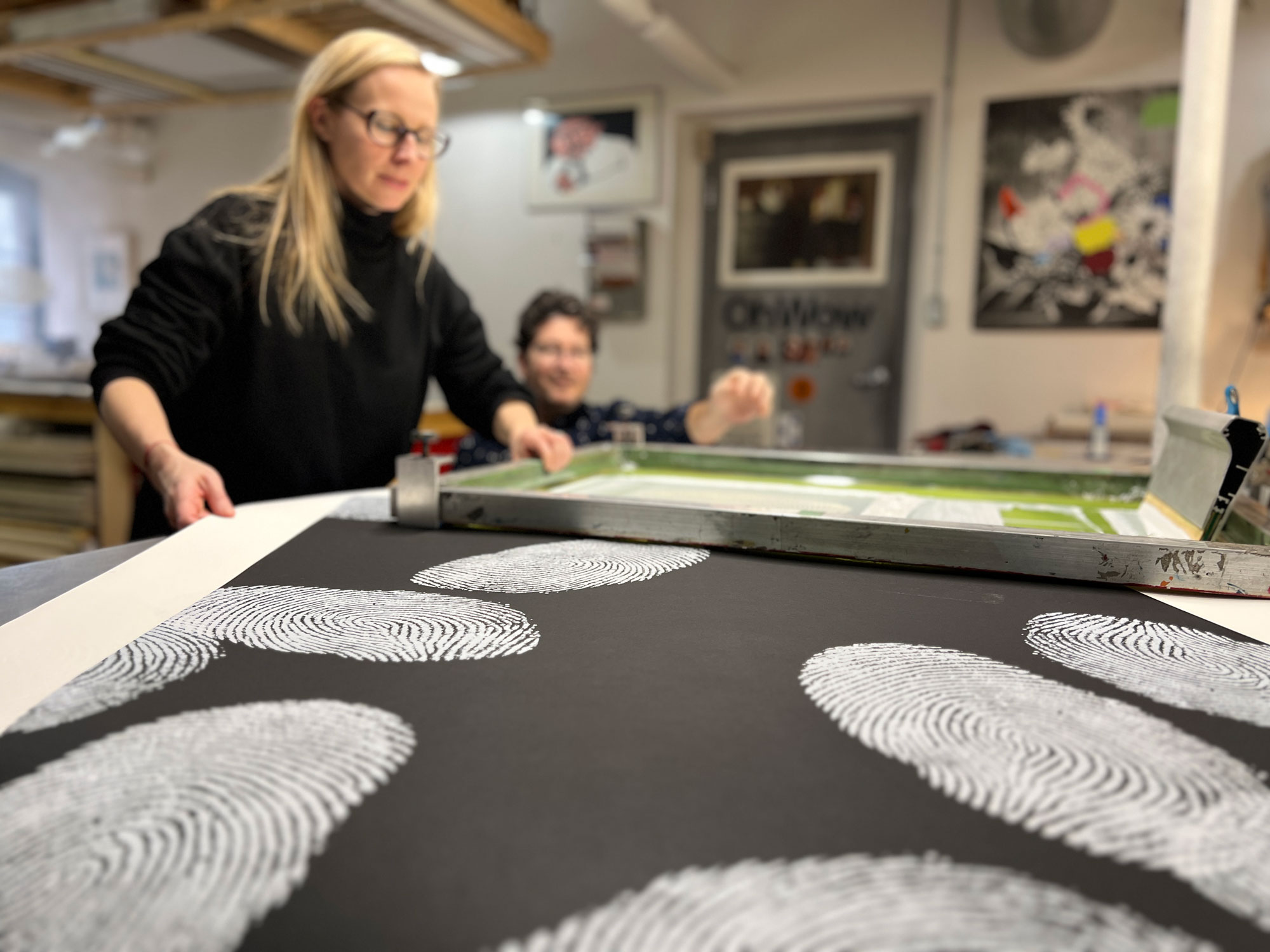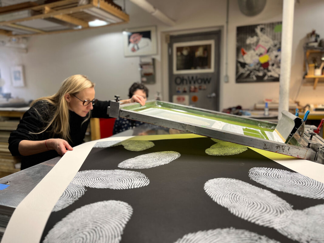 Kristiina Lahde and Adam David Brown produced a new series of work titled “Under the Influence” as 2022 Smokestack Analog Print Residency co-participants. Representing their first professional collaborative endeavour, Lahde and Brown used their own fingerprints as the foundation of imagery investigations that centred around the notion of touch. Working with Smokestack’s analog printmaker, Laine Groeneweg, their experimentations with the layering, scale and patterning of their fingerprints created rhythmic networks and cross-hatched connections.