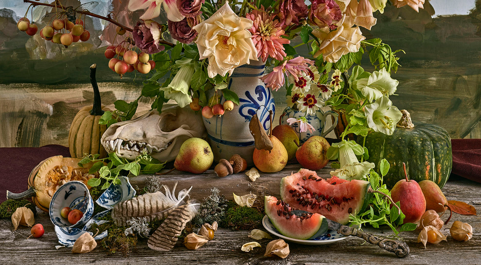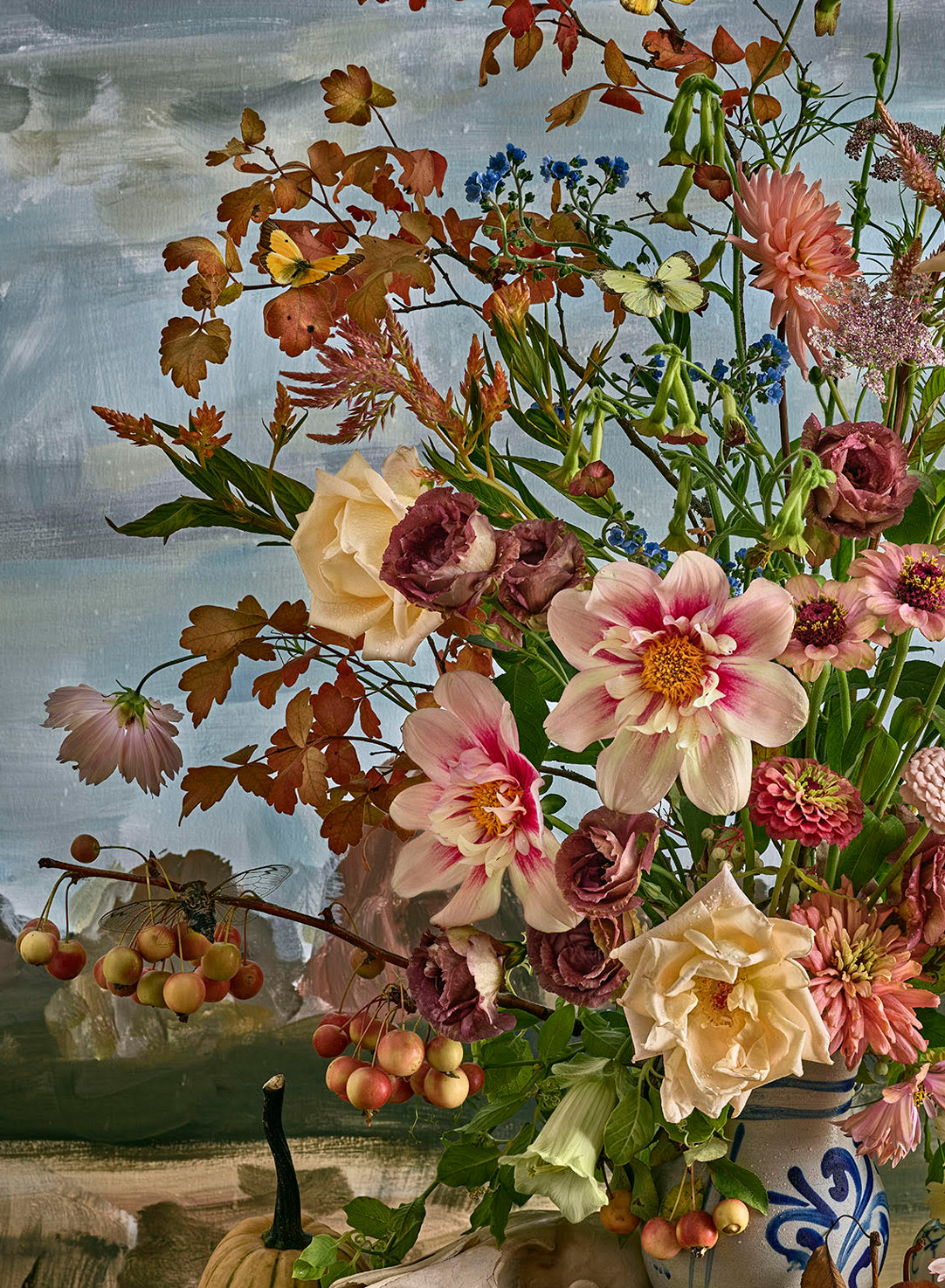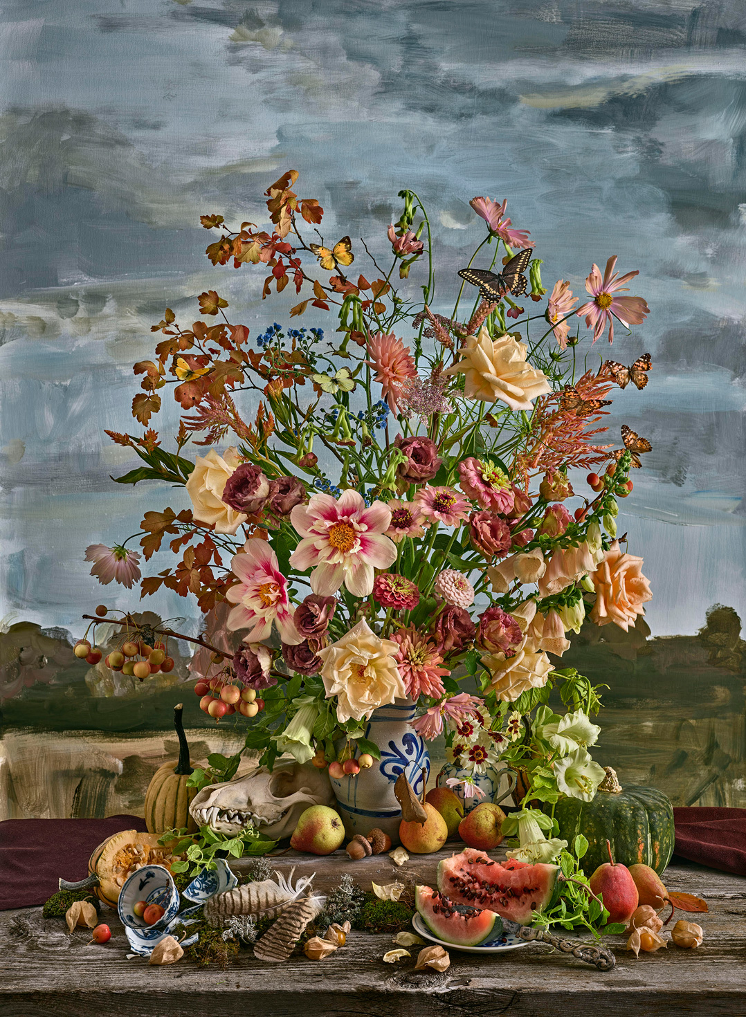 Autumn is amongst the latest grouping of collaborative print projects between Sjaarda and Smokestack’s digital printmaker, Jonathan Groeneweg that engage the exceptional capabilities of advanced digital imaging technology to capture the arrangement in hyper depth and clarity. The integration of a painted background behind the arrangement (also a collaborative contribution by artist Nancy Friedland) further underscores the wide scope of artistic processes engaged to portray Sjaarda’s subject.