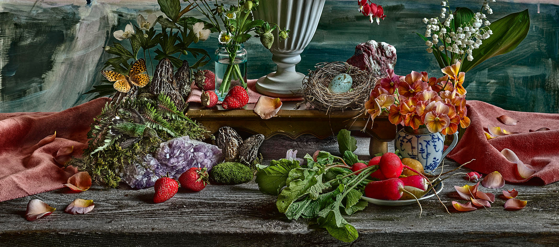 Summer is amongst the latest grouping of collaborative print projects between Sjaarda and Smokestack’s digital printmaker, Jonathan Groeneweg that engage the exceptional capabilities of advanced digital imaging technology to capture the arrangement in hyper depth and clarity. The integration of a painted background behind the arrangement (also a collaborative contribution by artist Nancy Friedland) further underscores the wide scope of artistic processes engaged to portray Sjaarda’s subject.