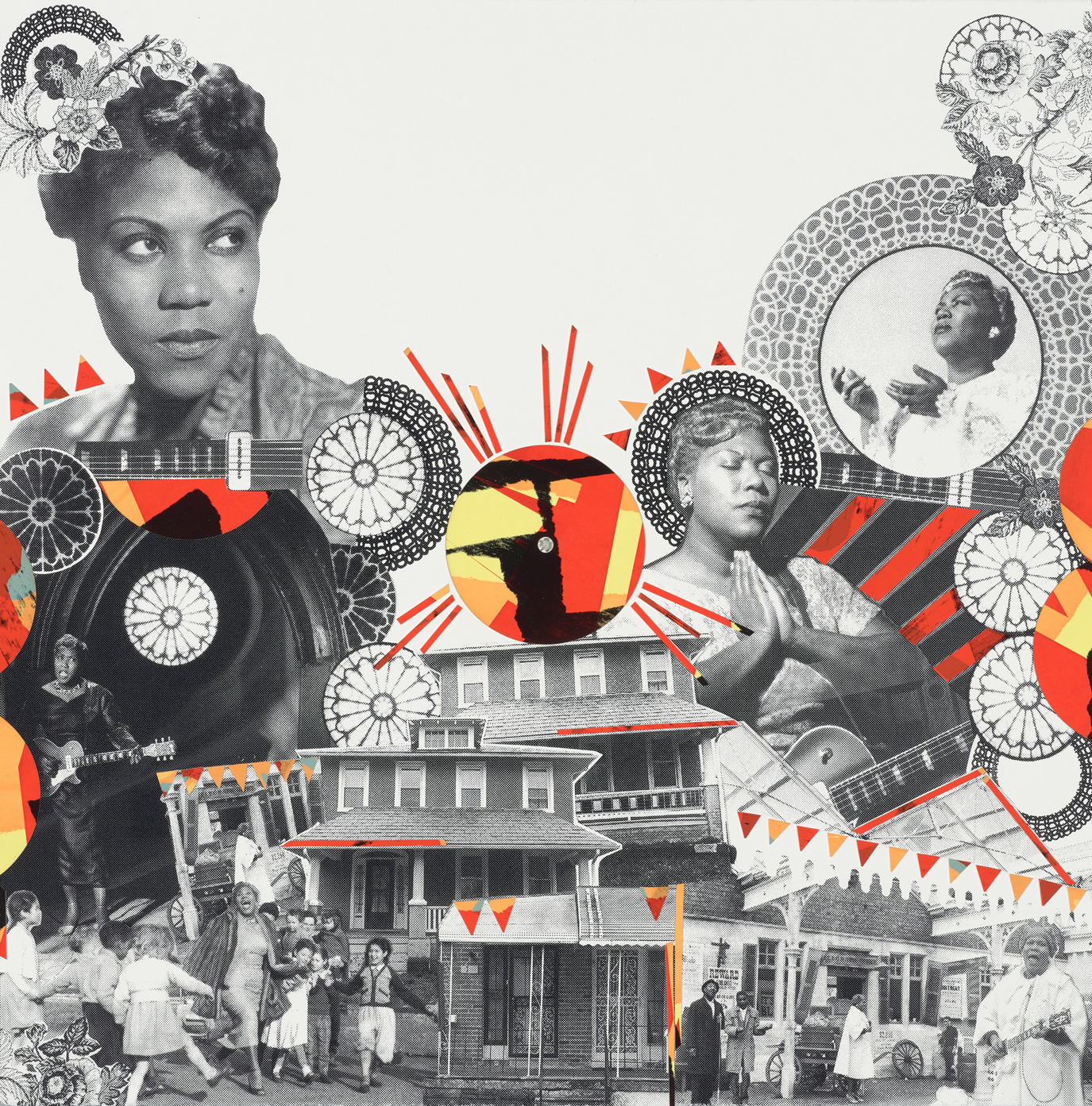 • Screenprint with hand-embelishment and collage with applied silkscreen centrepiece