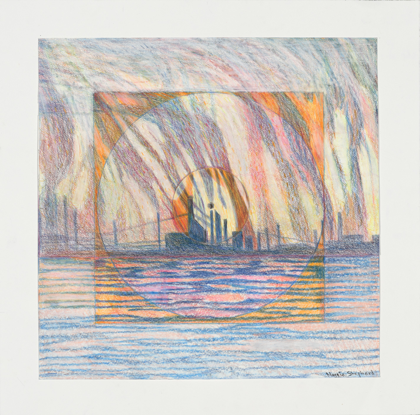 • Coloured pencil on paper with applied silkscreen centrepiece