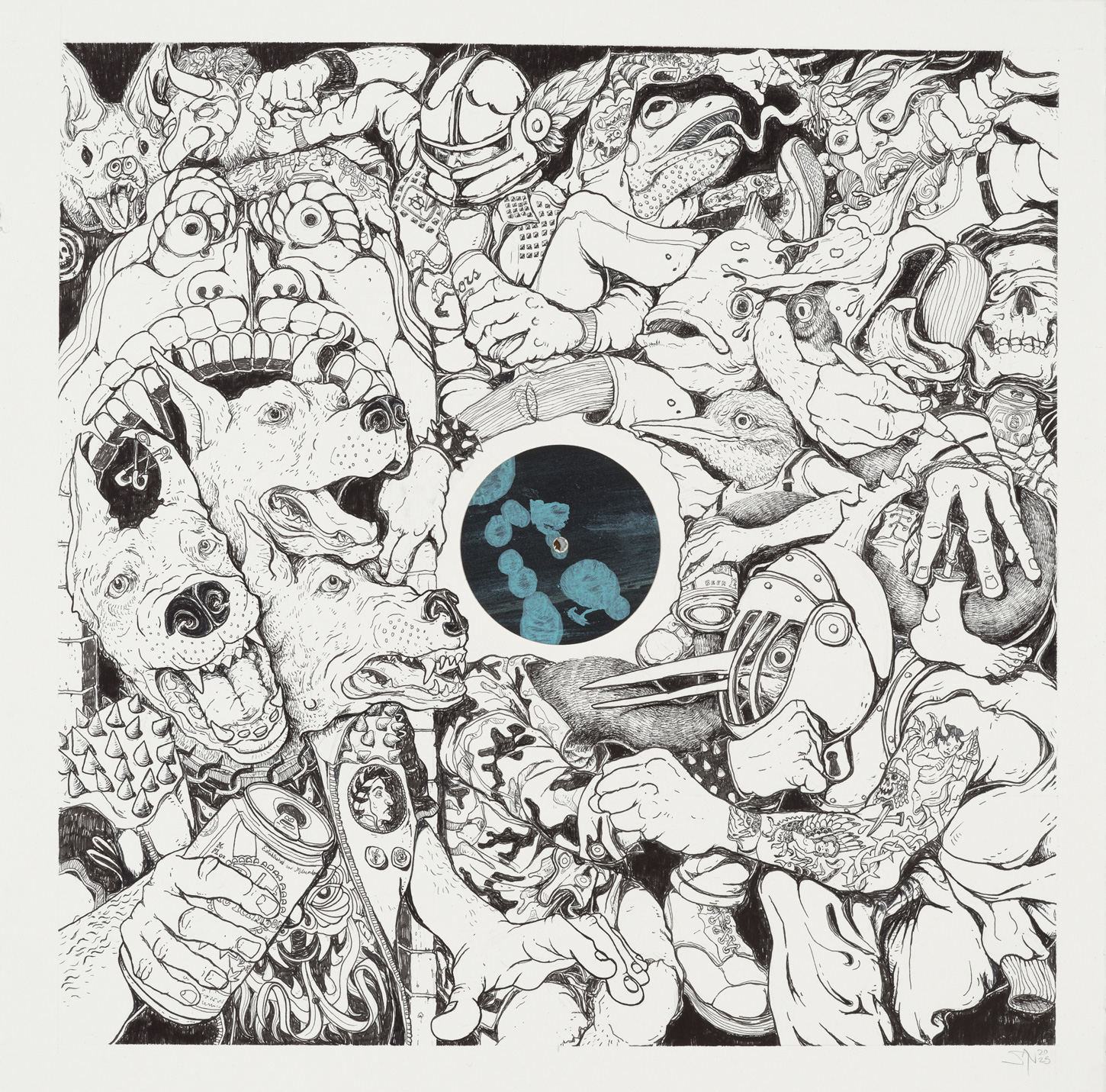 • Pen and ink on paper with applied silkscreen centrepiece