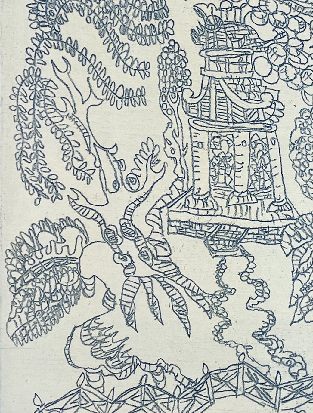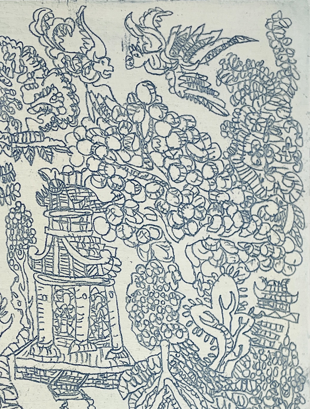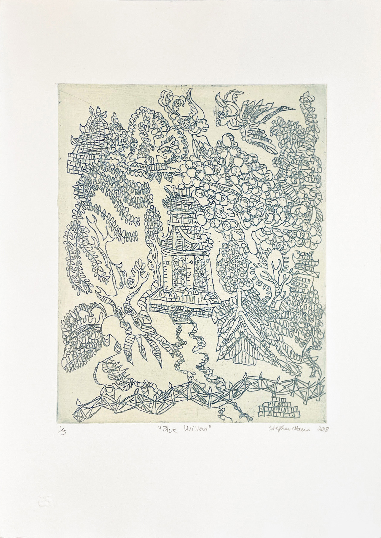 In Blue Willow, Stephen Altena expands his explorations of ornamental patterning and decoration into soft-ground etching. Created and presented at Smokestack’s 2018 Off-Cuts exhibition, curated by Hundred Dollar Gallery.