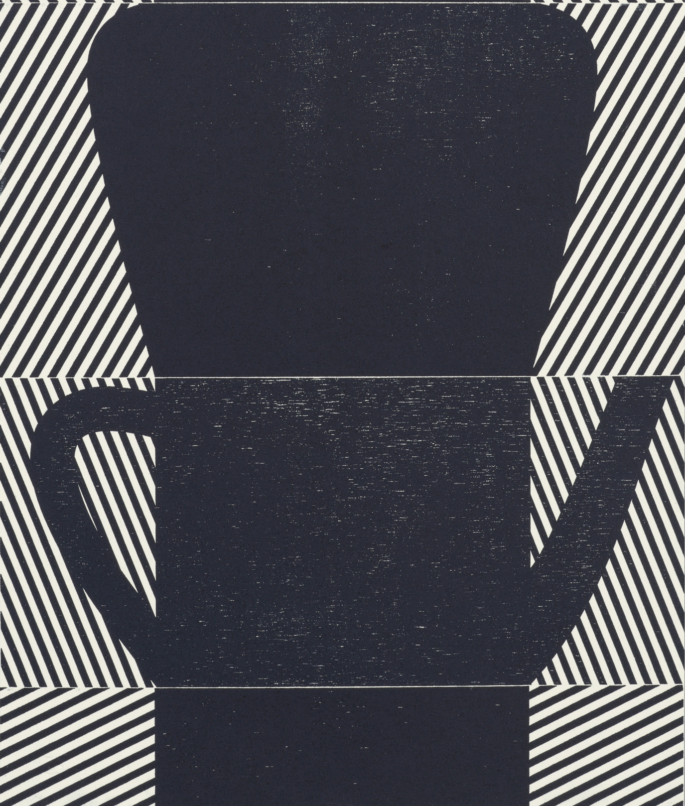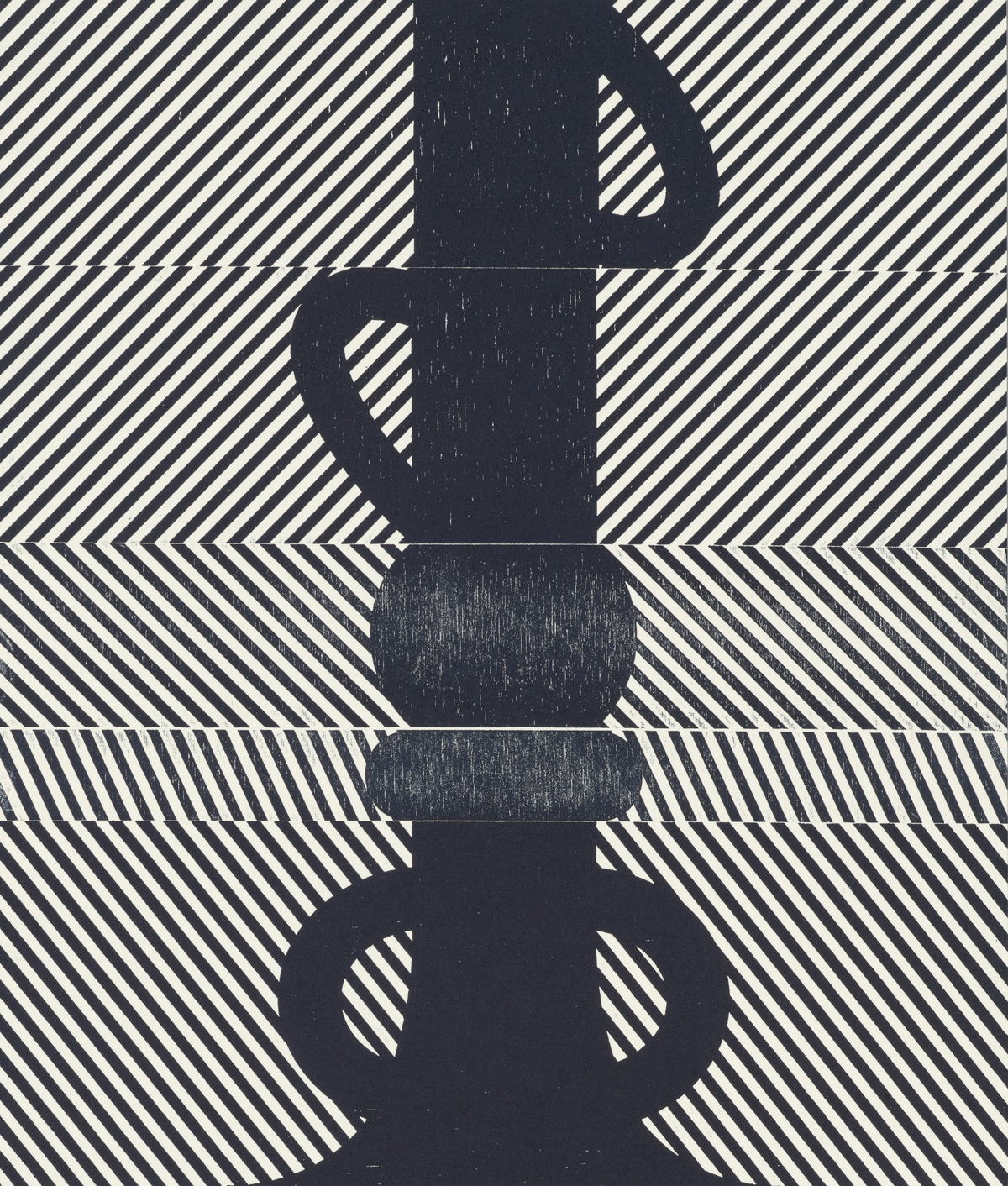 Smith’s 2025 Smokestack Analog Print Residency project, Imagined Archives, represented her introduction to relief printmaking as a new method of approach within her practice. For the making of this project, Smith created a vocabulary of graphic shapes and linear patterning fabricated into modular wood-cut pieces. Through collaborative exploration by Smith and Smokestack’s analog printmaker, Laine Groeneweg, these pieces were then rearranged into a multitude of blocked compositions to ink and pull through the press. Suggestive of a collection of vessels – or perhaps abstracted figures – each print demonstrates a unique intersection of spatial relationships, tonal densities, and playful experimentations.