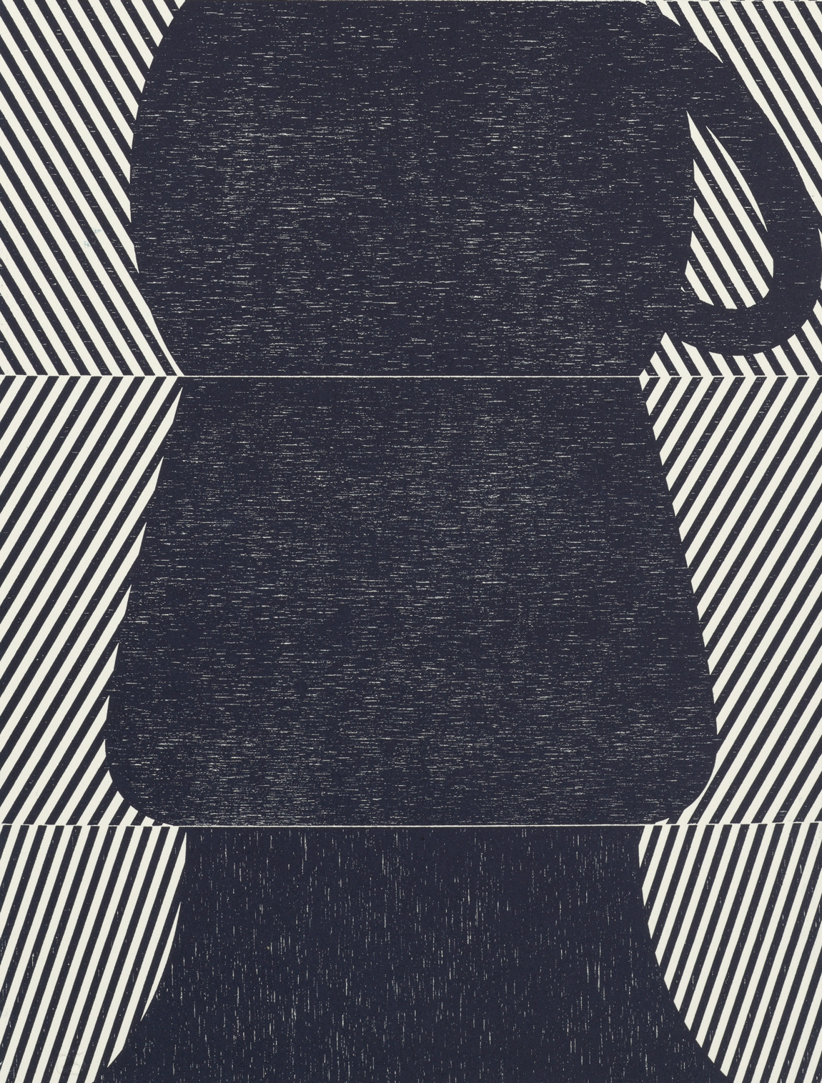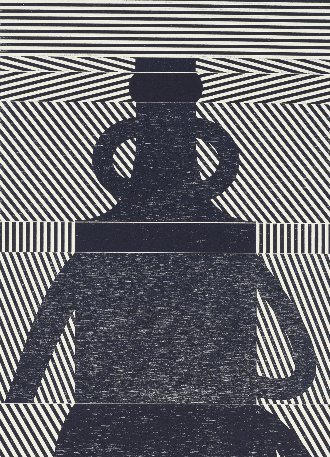 Smith’s 2025 Smokestack Analog Print Residency project, Imagined Archives, represented her introduction to relief printmaking as a new method of approach within her practice. For the making of this project, Smith created a vocabulary of graphic shapes and linear patterning fabricated into modular wood-cut pieces. Through collaborative exploration by Smith and Smokestack’s analog printmaker, Laine Groeneweg, these pieces were then rearranged into a multitude of blocked compositions to ink and pull through the press. Suggestive of a collection of vessels – or perhaps abstracted figures – each print demonstrates a unique intersection of spatial relationships, tonal densities, and playful experimentations.