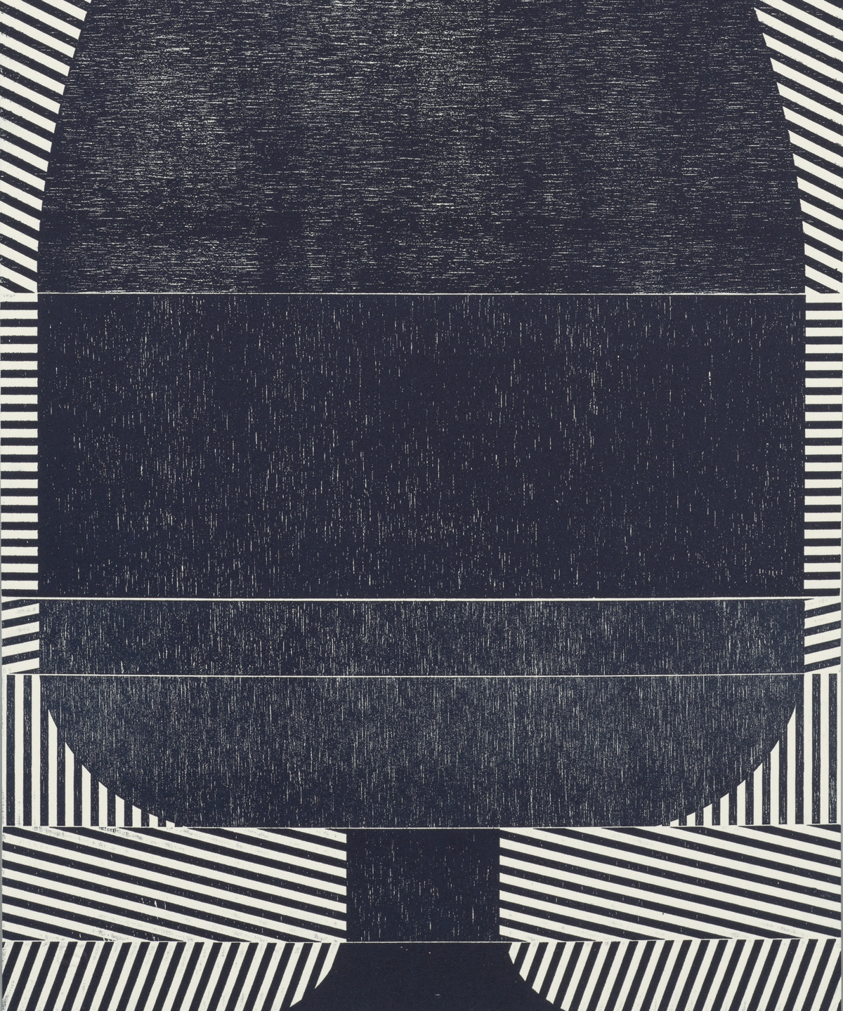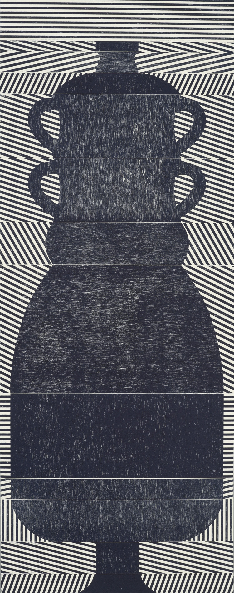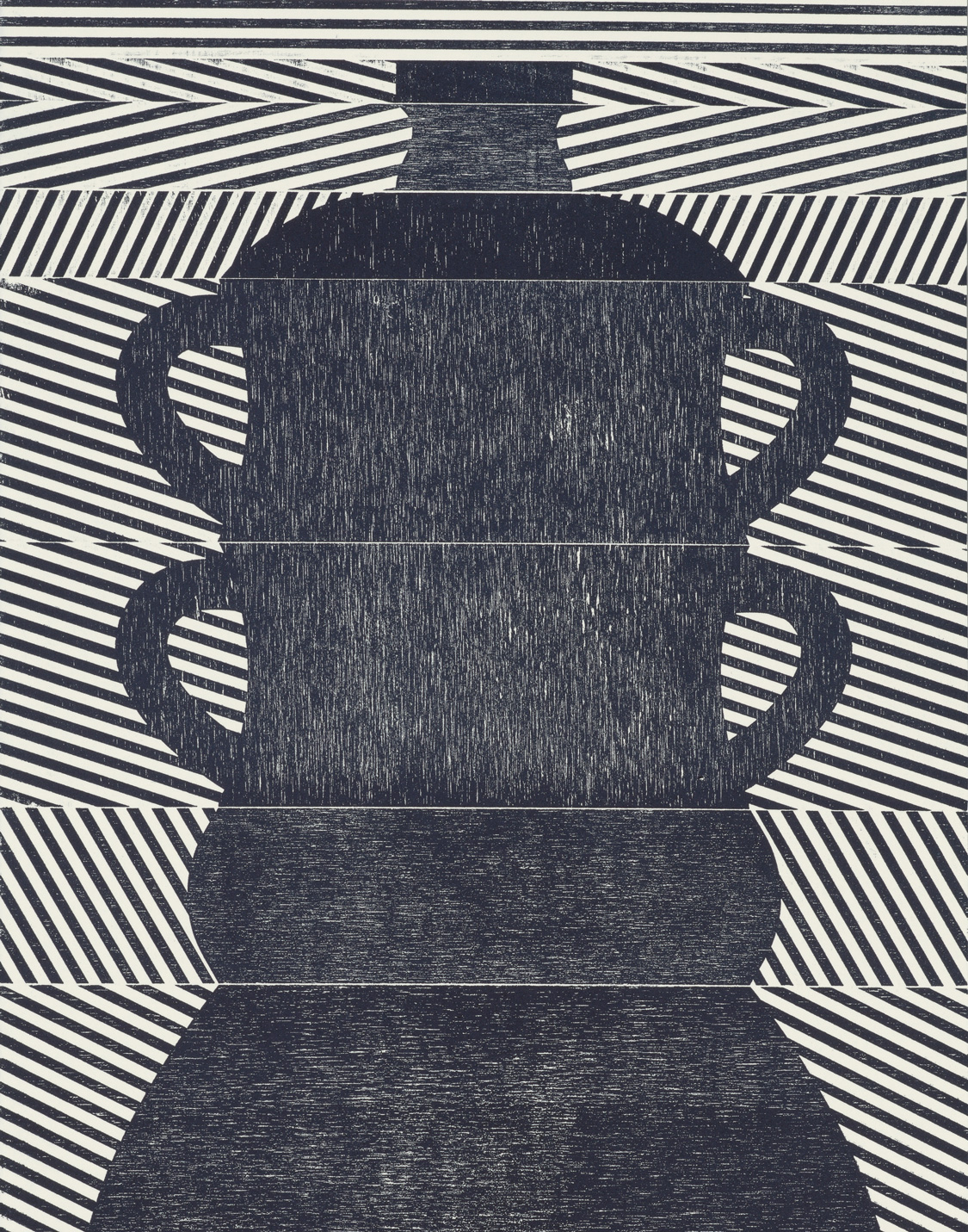 Smith’s 2025 Smokestack Analog Print Residency project, Imagined Archives, represented her introduction to relief printmaking as a new method of approach within her practice. For the making of this project, Smith created a vocabulary of graphic shapes and linear patterning fabricated into modular wood-cut pieces. Through collaborative exploration by Smith and Smokestack’s analog printmaker, Laine Groeneweg, these pieces were then rearranged into a multitude of blocked compositions to ink and pull through the press. Suggestive of a collection of vessels – or perhaps abstracted figures – each print demonstrates a unique intersection of spatial relationships, tonal densities, and playful experimentations.