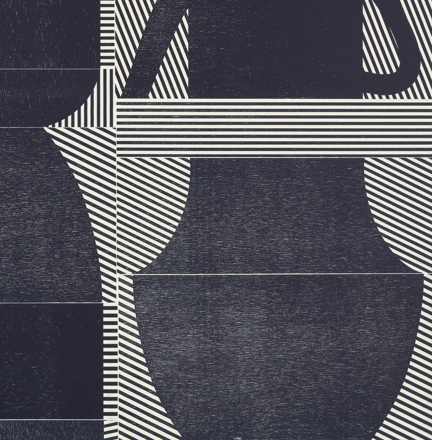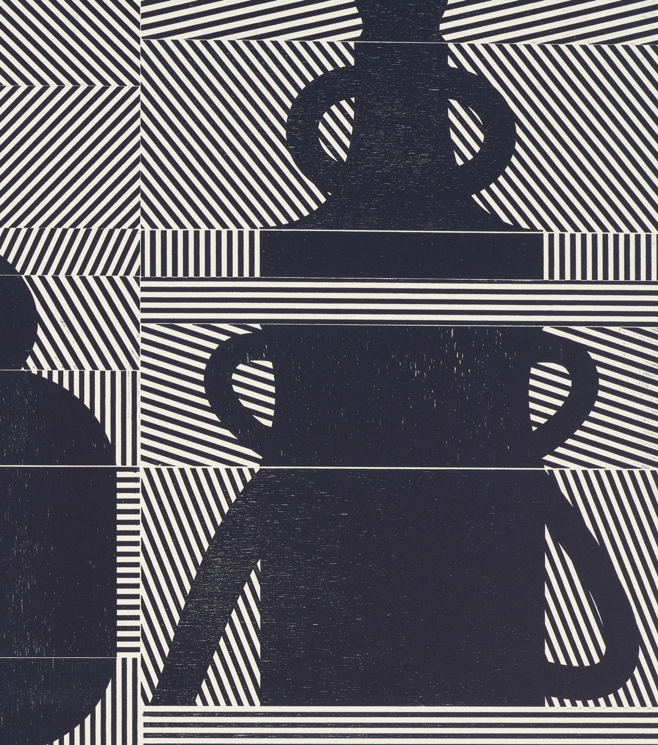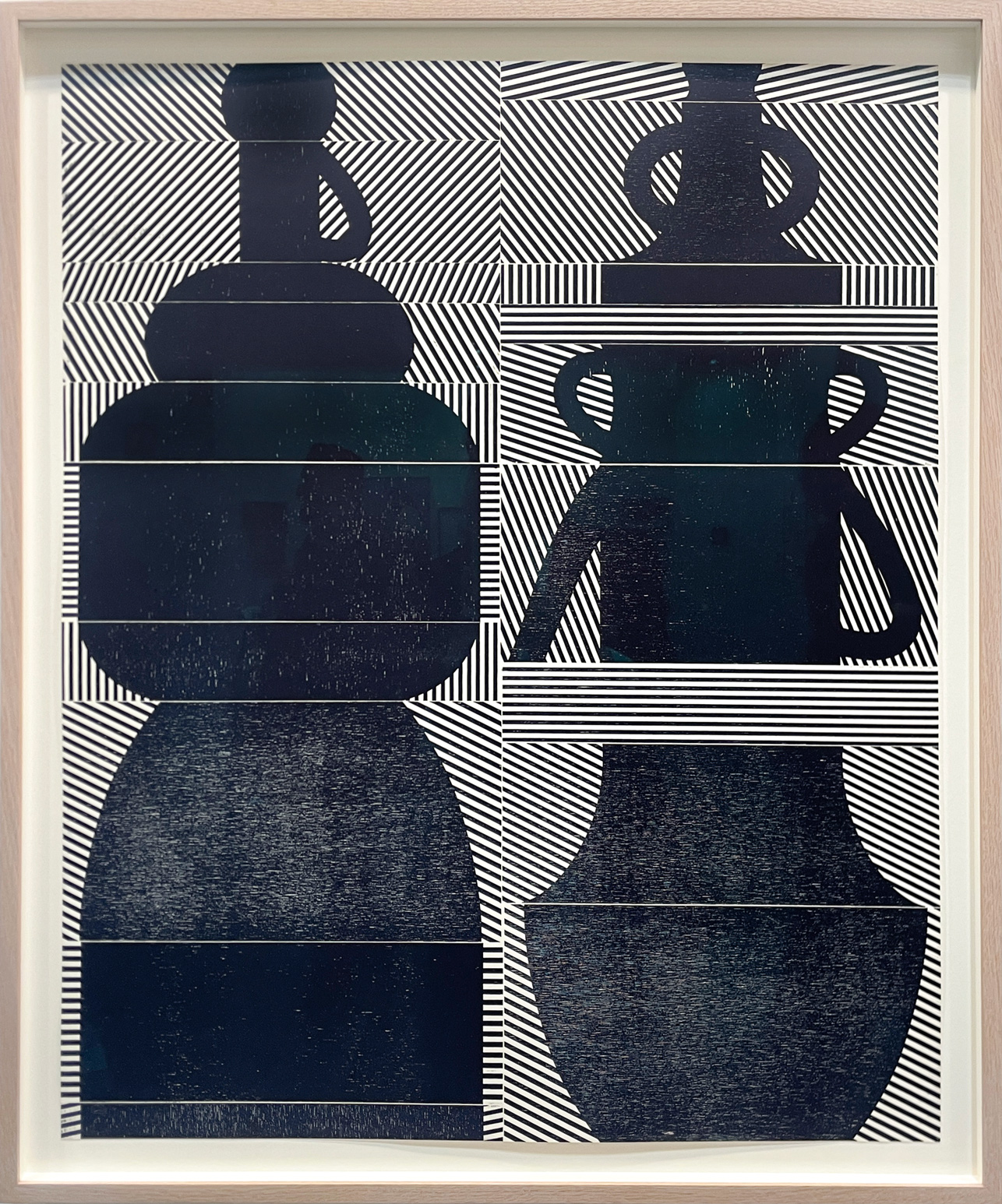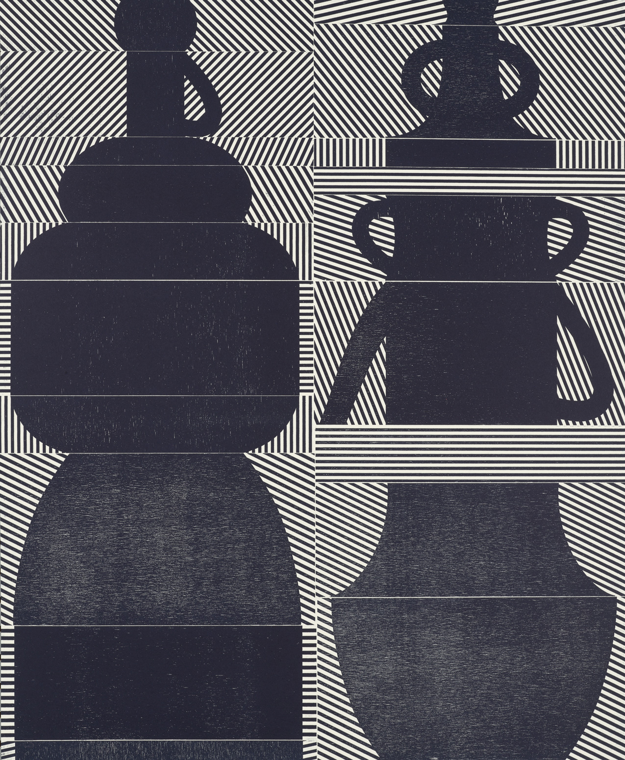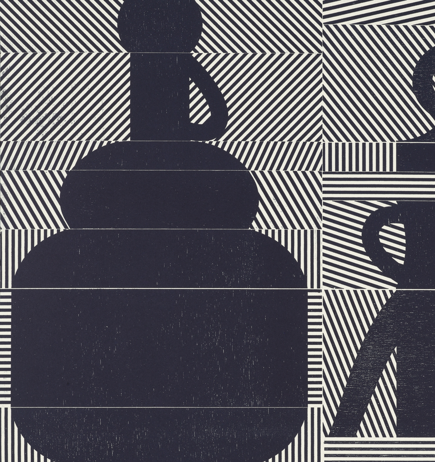 Smith’s 2025 Smokestack Analog Print Residency project, Imagined Archives, represented her introduction to relief printmaking as a new method of approach within her practice. For the making of this project, Smith created a vocabulary of graphic shapes and linear patterning fabricated into modular wood-cut pieces. Through collaborative exploration by Smith and Smokestack’s analog printmaker, Laine Groeneweg, these pieces were then rearranged into a multitude of blocked compositions to ink and pull through the press. Suggestive of a collection of vessels – or perhaps abstracted figures – each print demonstrates a unique intersection of spatial relationships, tonal densities, and playful experimentations.
