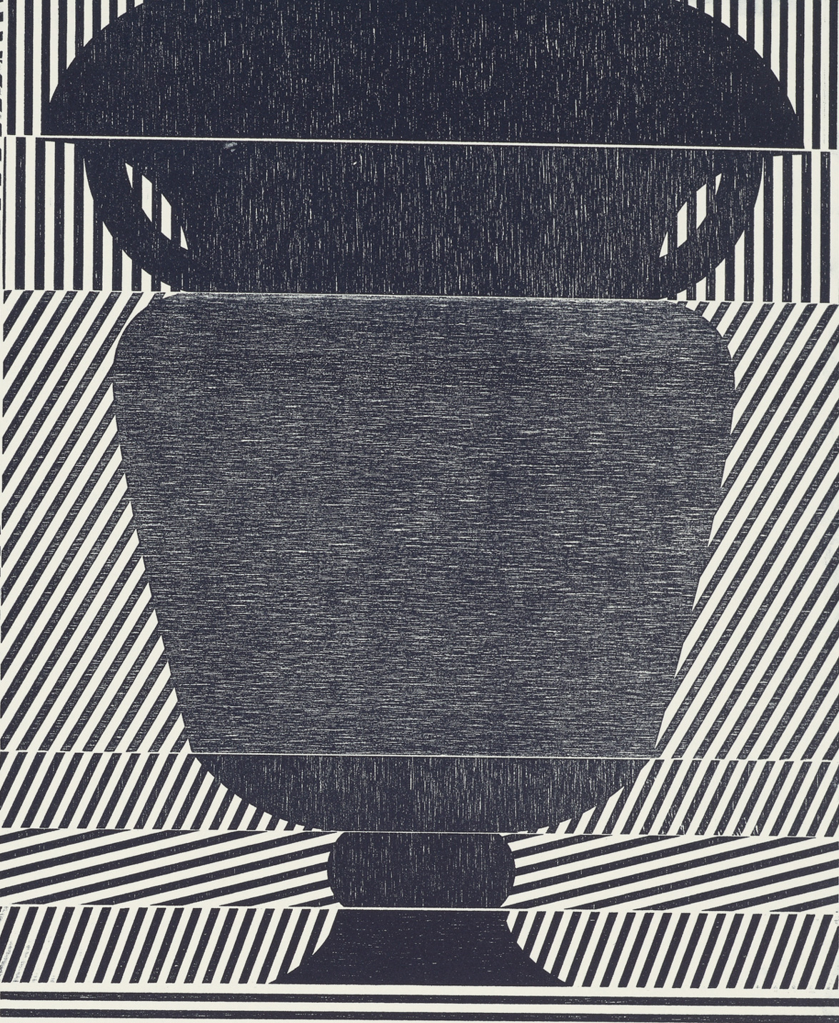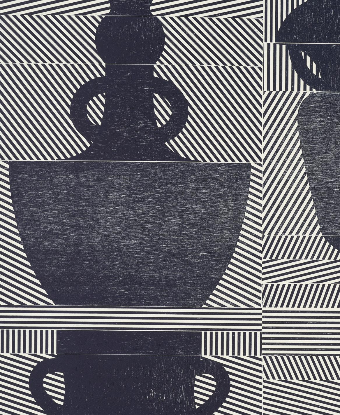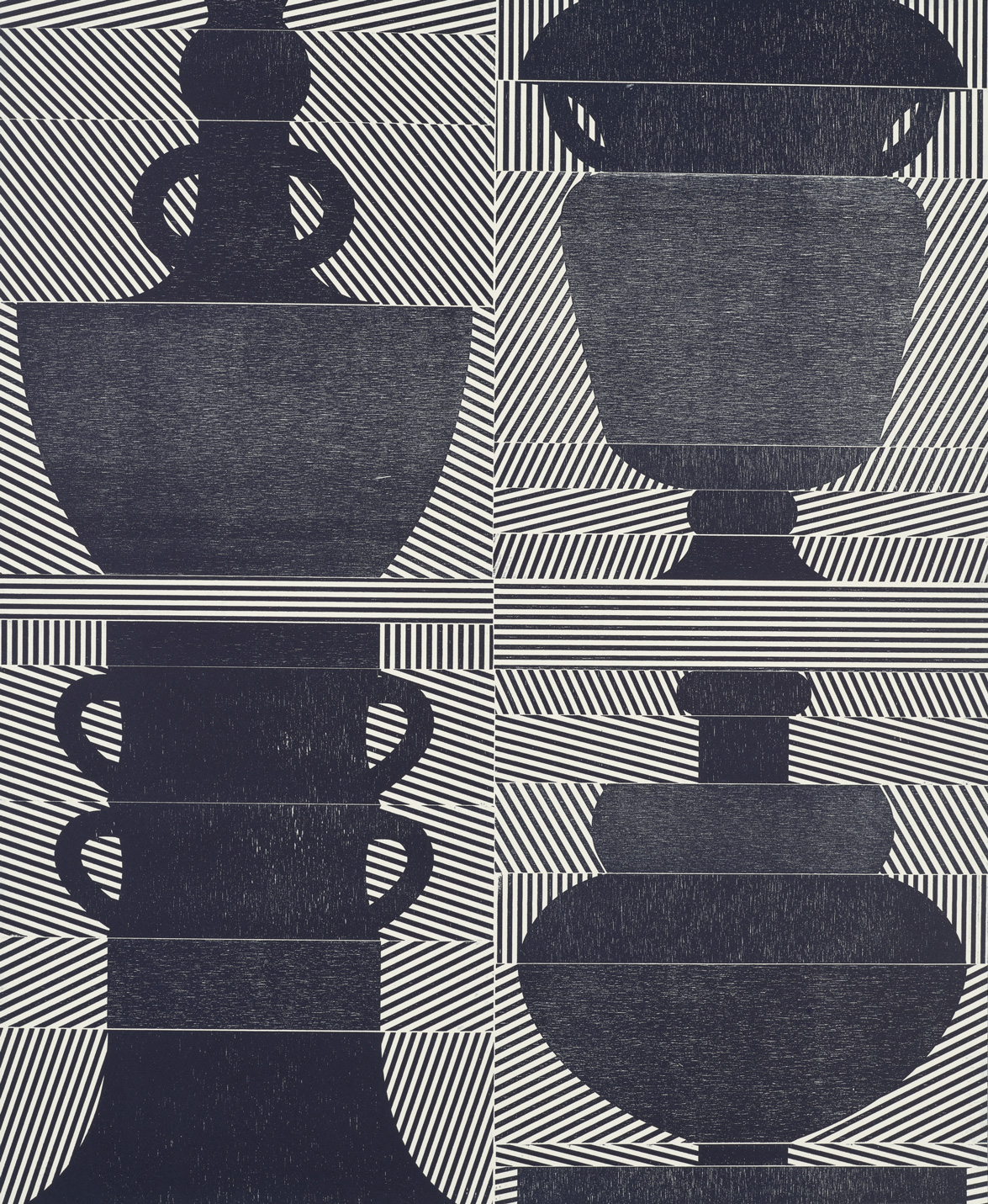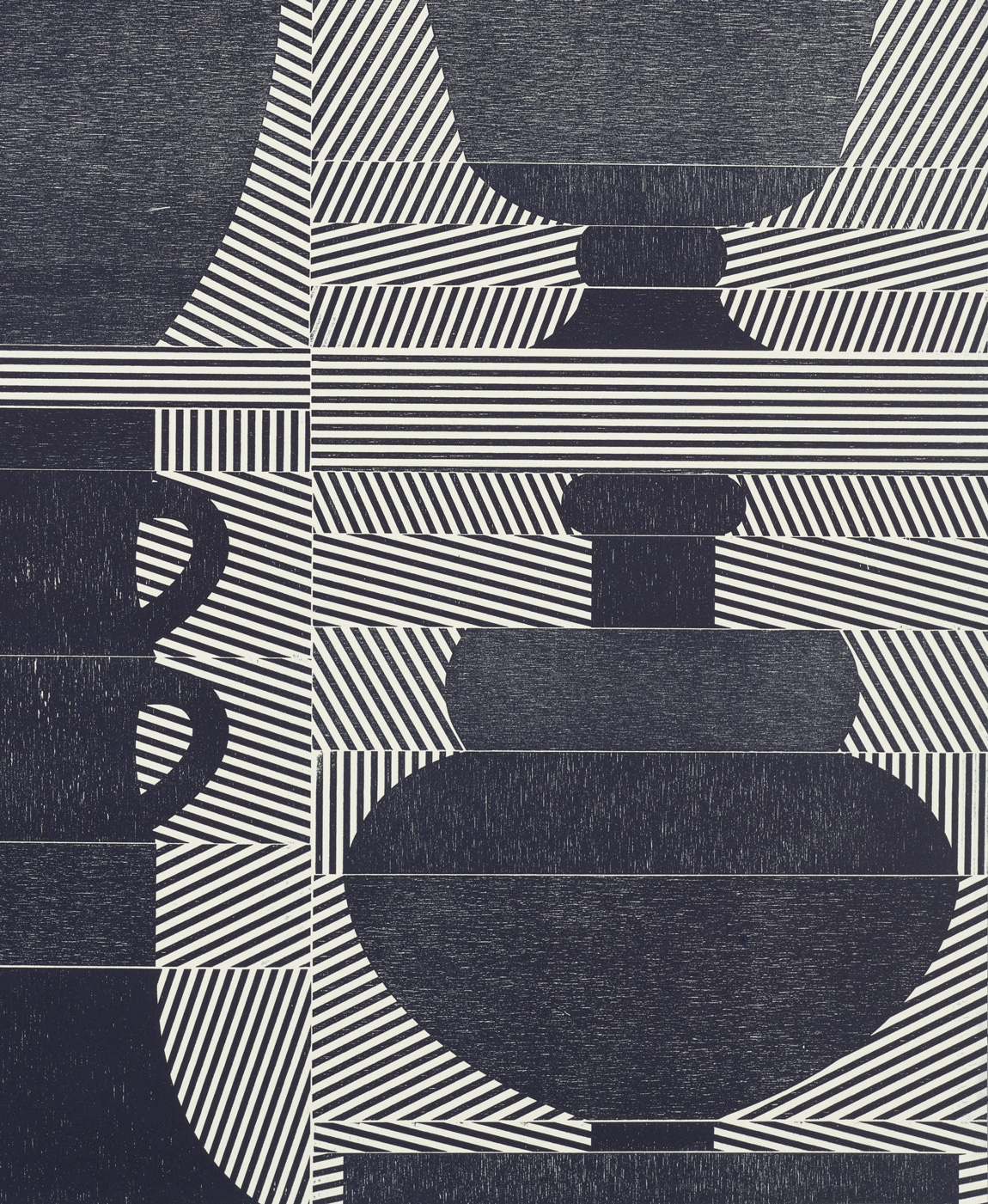 Smith’s 2025 Smokestack Analog Print Residency project, Imagined Archives, represented her introduction to relief printmaking as a new method of approach within her practice. For the making of this project, Smith created a vocabulary of graphic shapes and linear patterning fabricated into modular wood-cut pieces. Through collaborative exploration by Smith and Smokestack’s analog printmaker, Laine Groeneweg, these pieces were then rearranged into a multitude of blocked compositions to ink and pull through the press. Suggestive of a collection of vessels – or perhaps abstracted figures – each print demonstrates a unique intersection of spatial relationships, tonal densities, and playful experimentations.