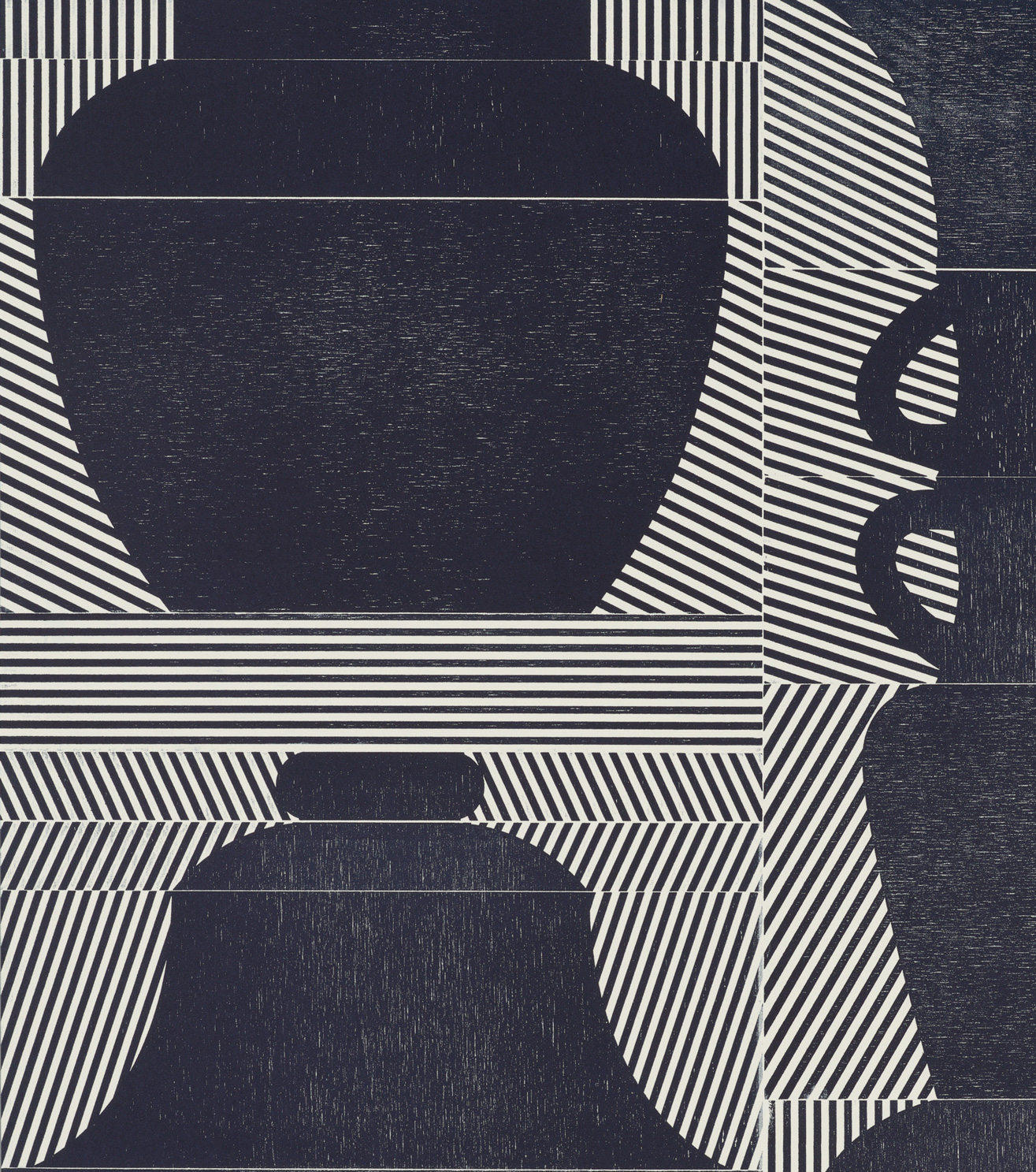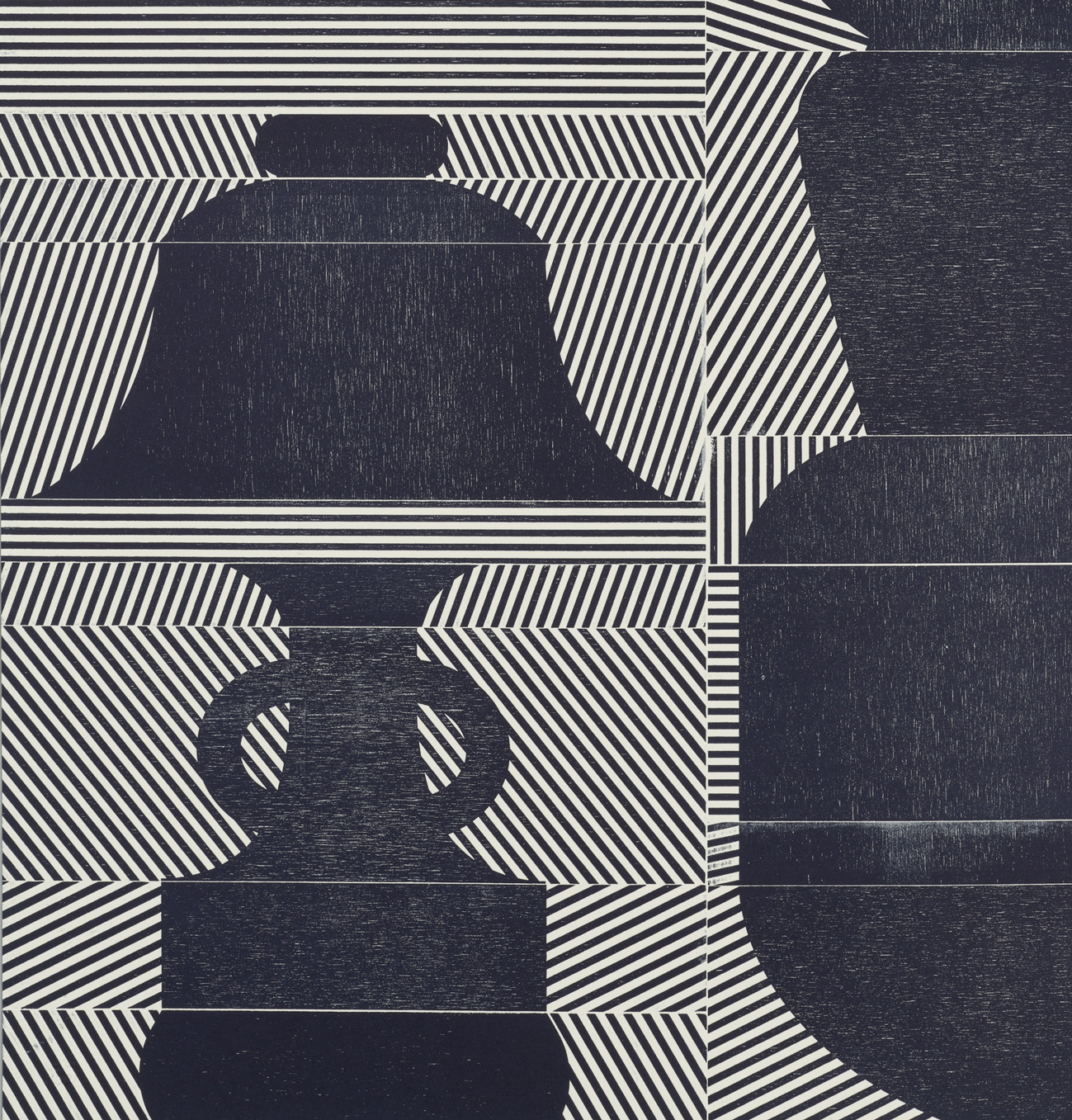 Smith’s 2025 Smokestack Analog Print Residency project, Imagined Archives, represented her introduction to relief printmaking as a new method of approach within her practice. For the making of this project, Smith created a vocabulary of graphic shapes and linear patterning fabricated into modular wood-cut pieces. Through collaborative exploration by Smith and Smokestack’s analog printmaker, Laine Groeneweg, these pieces were then rearranged into a multitude of blocked compositions to ink and pull through the press. Suggestive of a collection of vessels – or perhaps abstracted figures – each print demonstrates a unique intersection of spatial relationships, tonal densities, and playful experimentations.