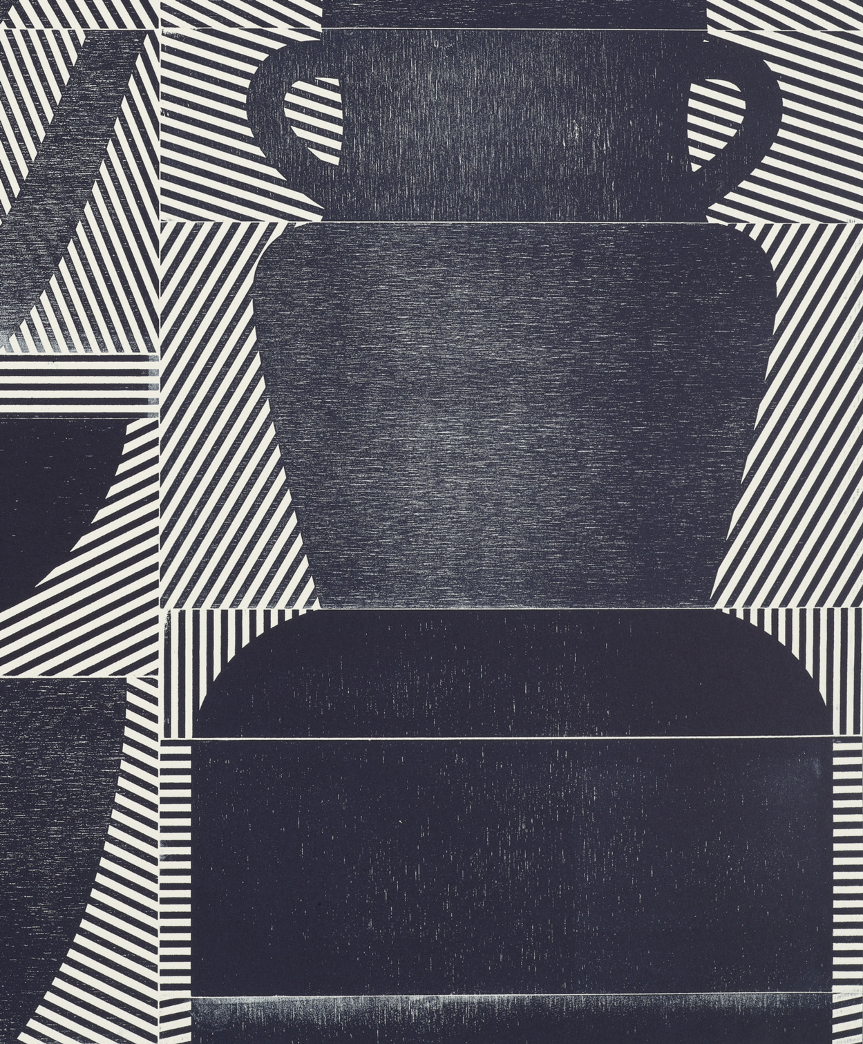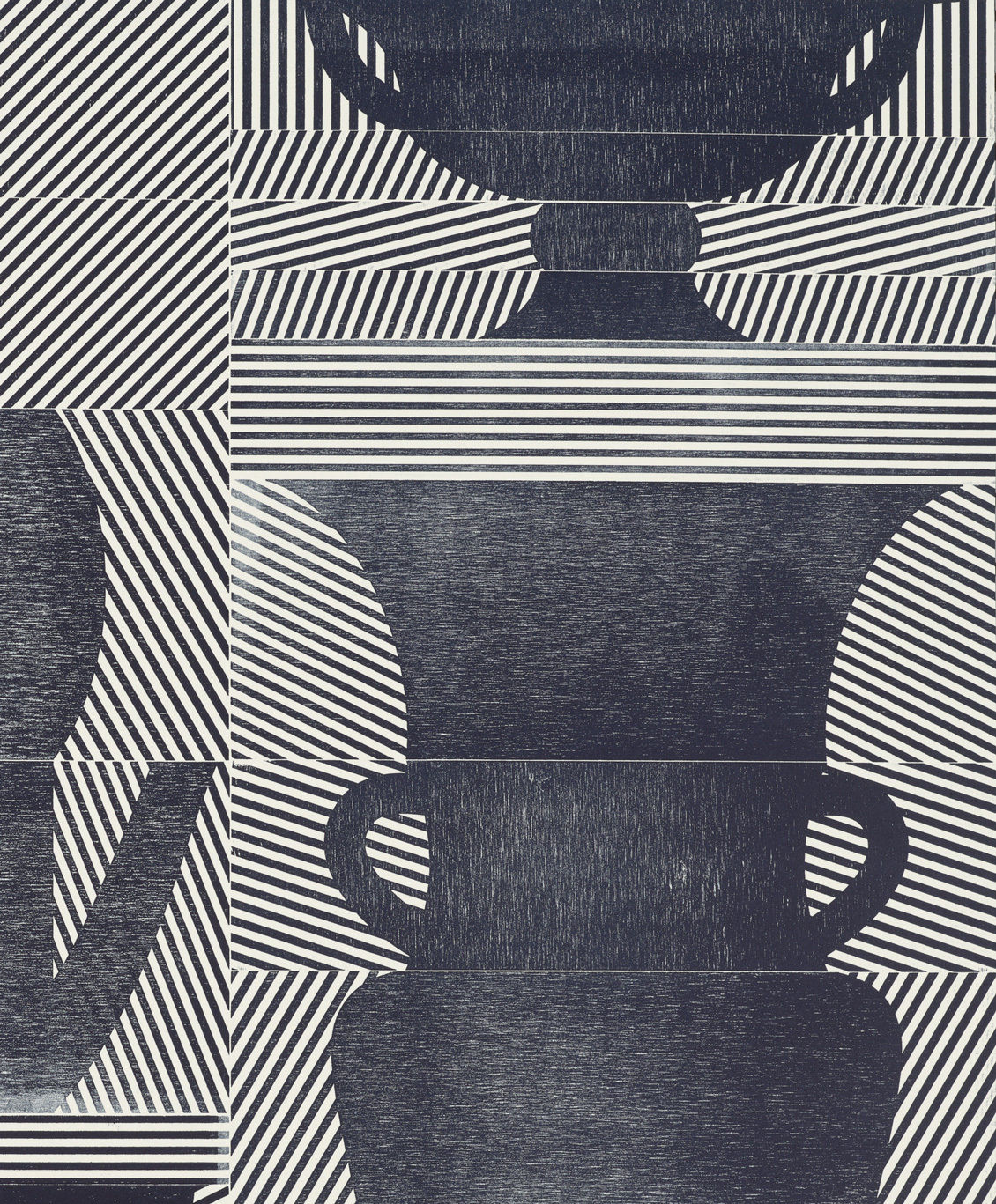 Smith’s 2025 Smokestack Analog Print Residency project, Imagined Archives, represented her introduction to relief printmaking as a new method of approach within her practice. For the making of this project, Smith created a vocabulary of graphic shapes and linear patterning fabricated into modular wood-cut pieces. Through collaborative exploration by Smith and Smokestack’s analog printmaker, Laine Groeneweg, these pieces were then rearranged into a multitude of blocked compositions to ink and pull through the press. Suggestive of a collection of vessels – or perhaps abstracted figures – each print demonstrates a unique intersection of spatial relationships, tonal densities, and playful experimentations.