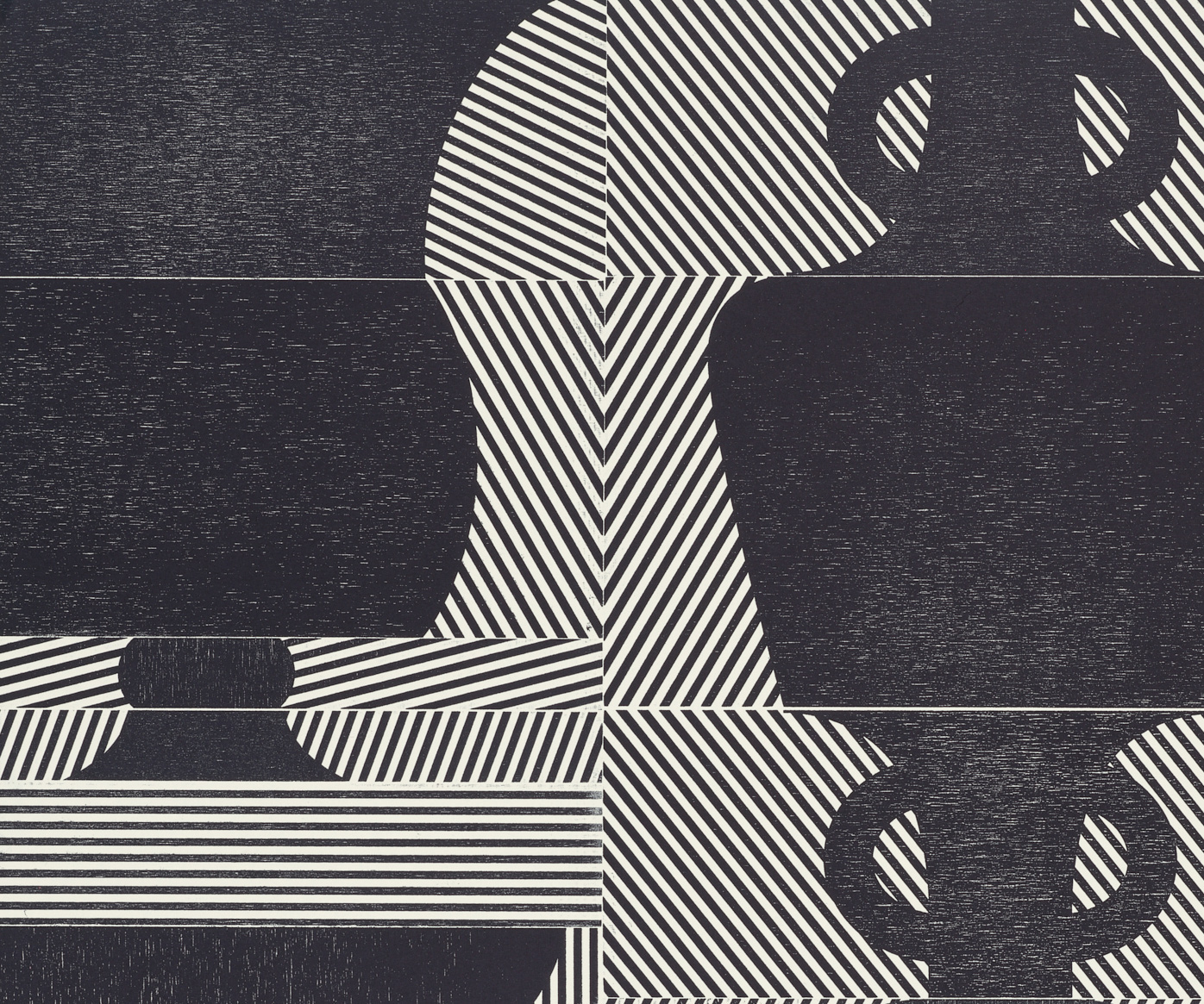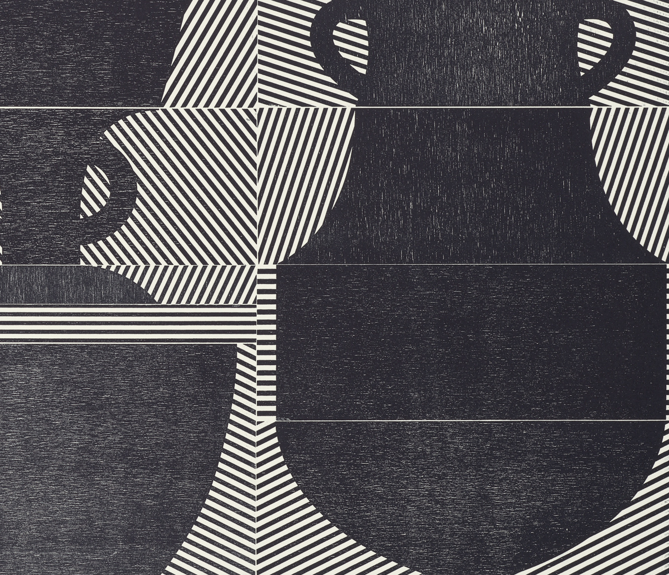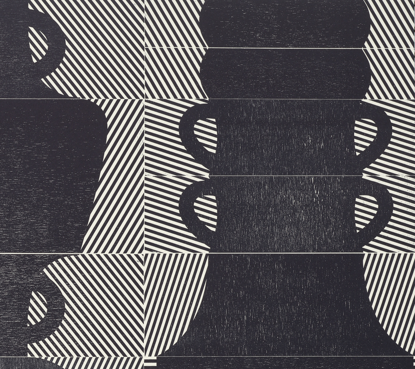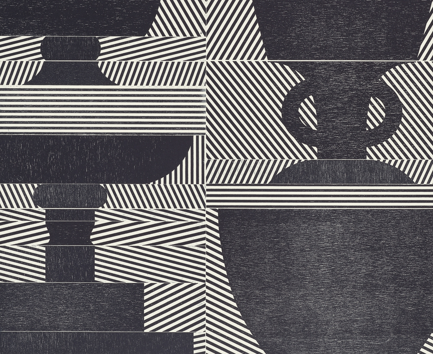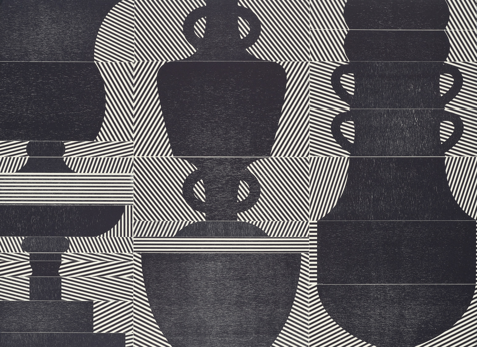 Smith’s 2025 Smokestack Analog Print Residency project, Imagined Archives, represented her introduction to relief printmaking as a new method of approach within her practice. For the making of this project, Smith created a vocabulary of graphic shapes and linear patterning fabricated into modular wood-cut pieces. Through collaborative exploration by Smith and Smokestack’s analog printmaker, Laine Groeneweg, these pieces were then rearranged into a multitude of blocked compositions to ink and pull through the press. Suggestive of a collection of vessels – or perhaps abstracted figures – each print demonstrates a unique intersection of spatial relationships, tonal densities, and playful experimentations.