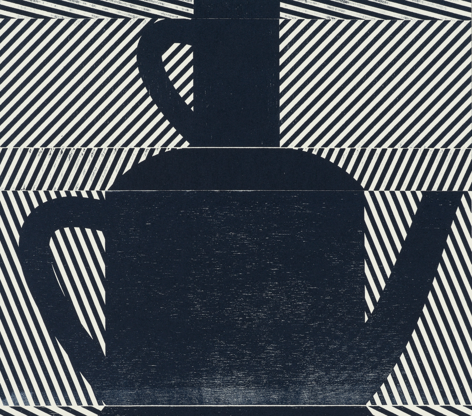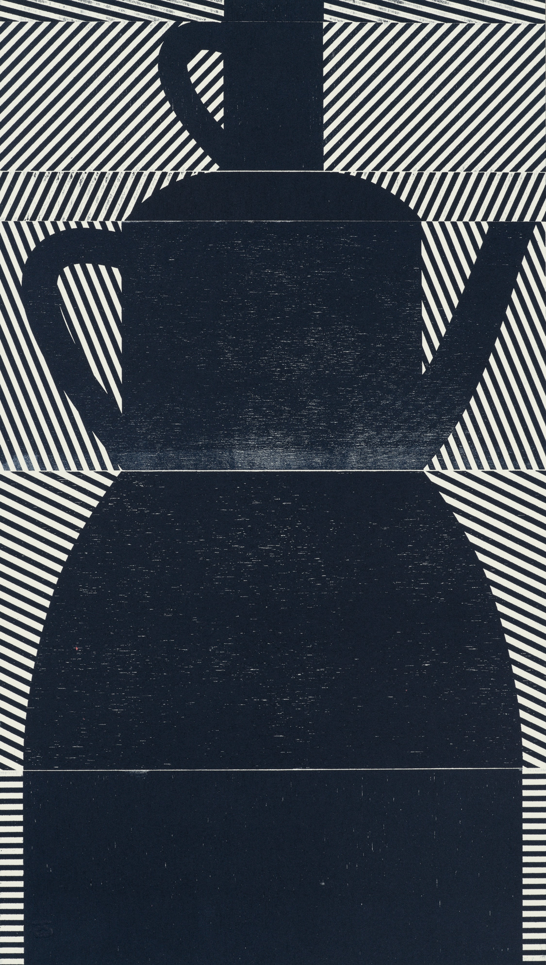 Smith’s 2025 Smokestack Analog Print Residency project, Imagined Archives, represented her introduction to relief printmaking as a new method of approach within her practice. For the making of this project, Smith created a vocabulary of graphic shapes and linear patterning fabricated into modular wood-cut pieces. Through collaborative exploration by Smith and Smokestack’s analog printmaker, Laine Groeneweg, these pieces were then rearranged into a multitude of blocked compositions to ink and pull through the press. Suggestive of a collection of vessels – or perhaps abstracted figures – each print demonstrates a unique intersection of spatial relationships, tonal densities, and playful experimentations.