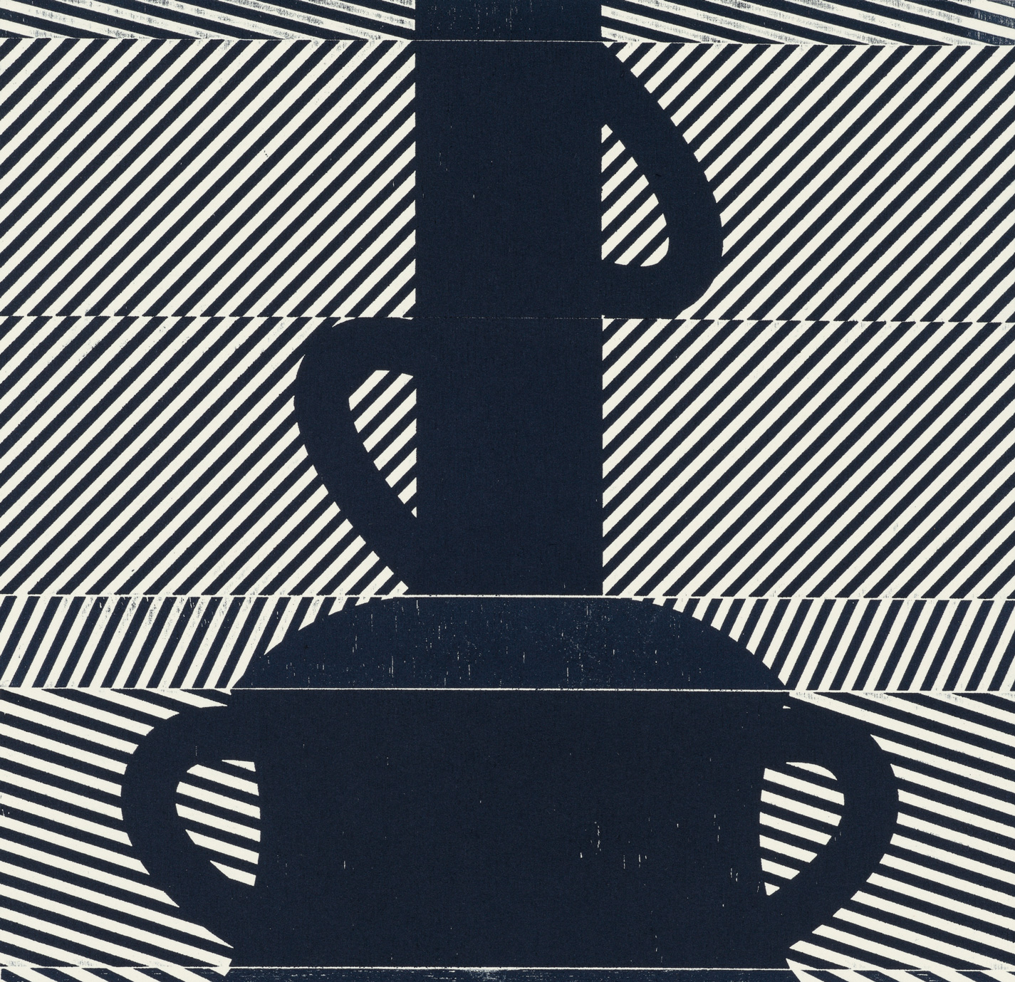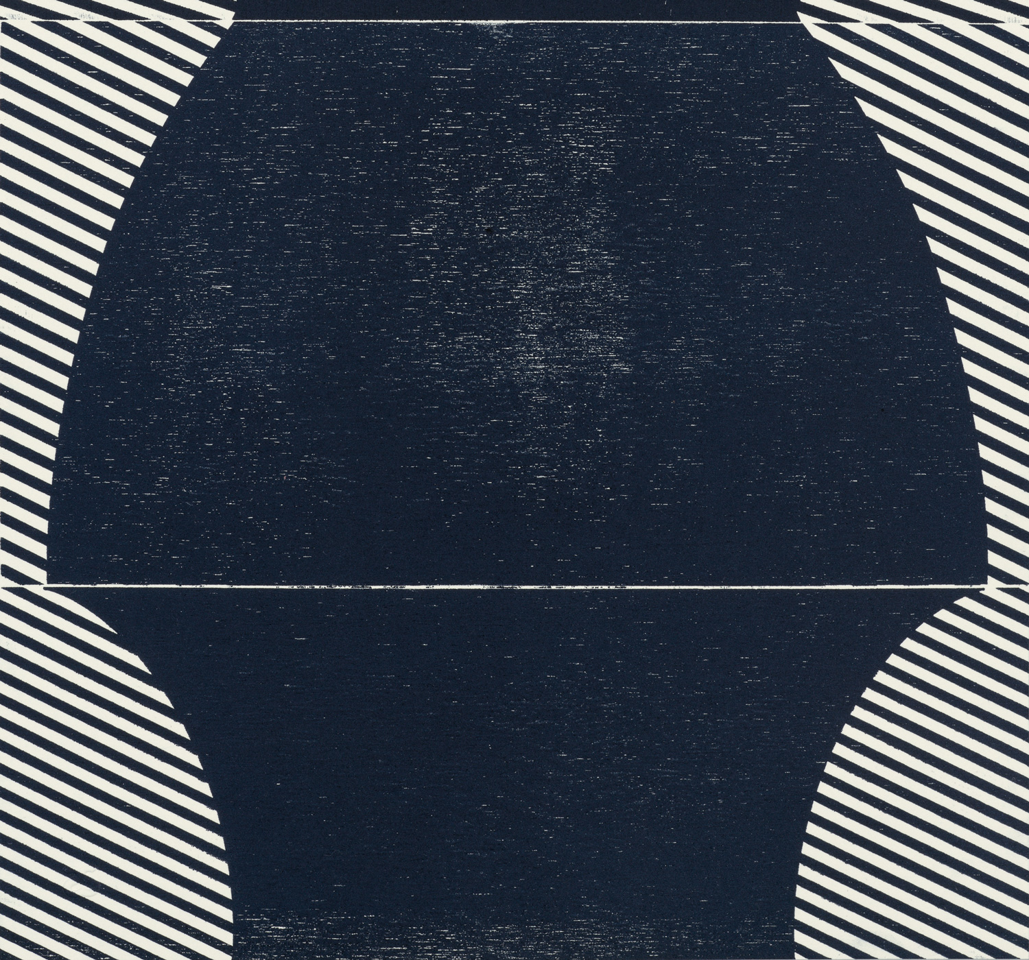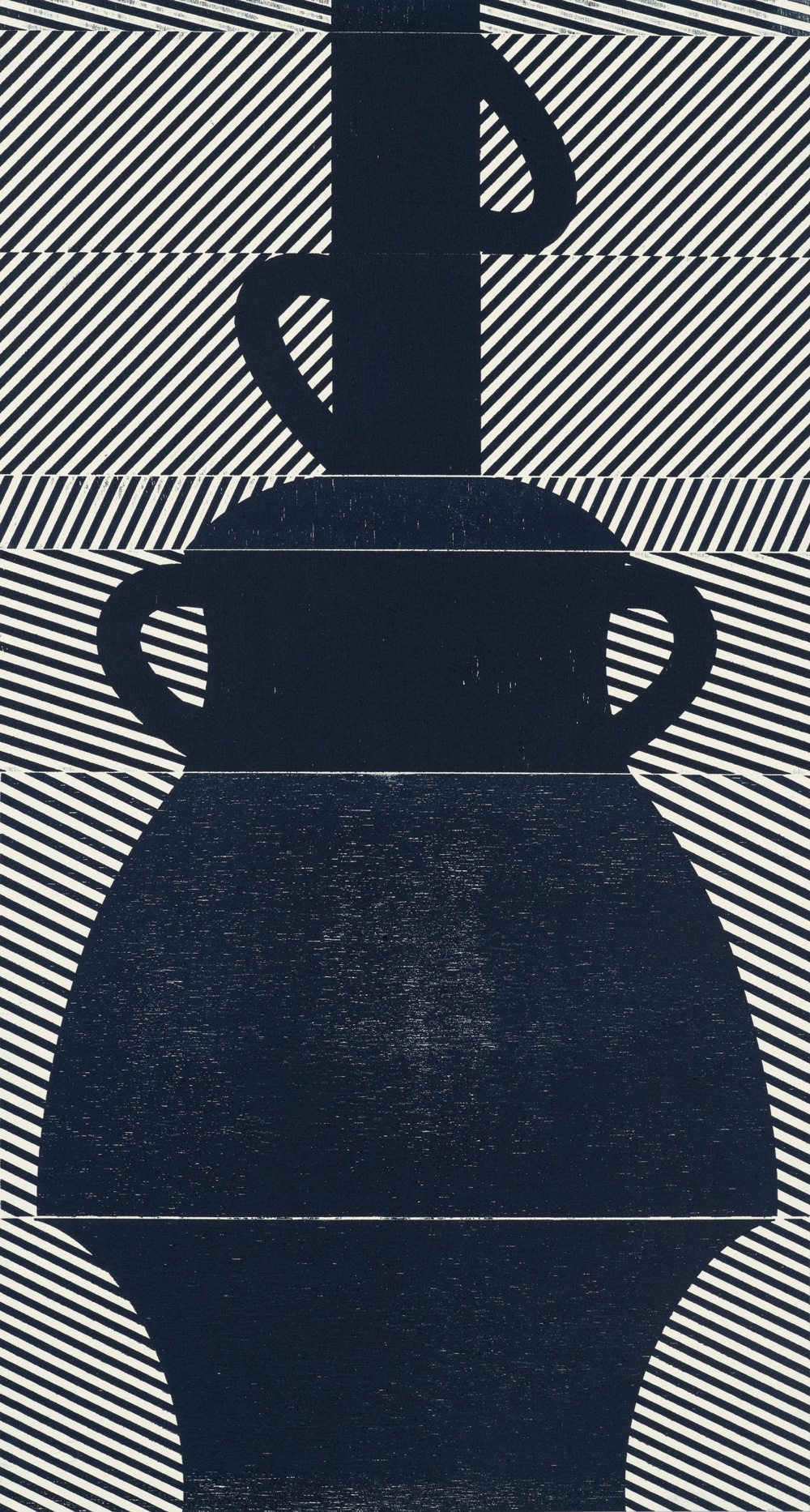 Smith’s 2025 Smokestack Analog Print Residency project, Imagined Archives, represented her introduction to relief printmaking as a new method of approach within her practice. For the making of this project, Smith created a vocabulary of graphic shapes and linear patterning fabricated into modular wood-cut pieces. Through collaborative exploration by Smith and Smokestack’s analog printmaker, Laine Groeneweg, these pieces were then rearranged into a multitude of blocked compositions to ink and pull through the press. Suggestive of a collection of vessels – or perhaps abstracted figures – each print demonstrates a unique intersection of spatial relationships, tonal densities, and playful experimentations.