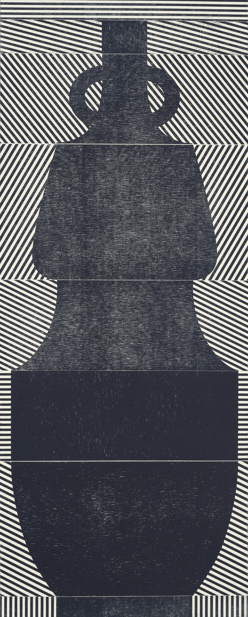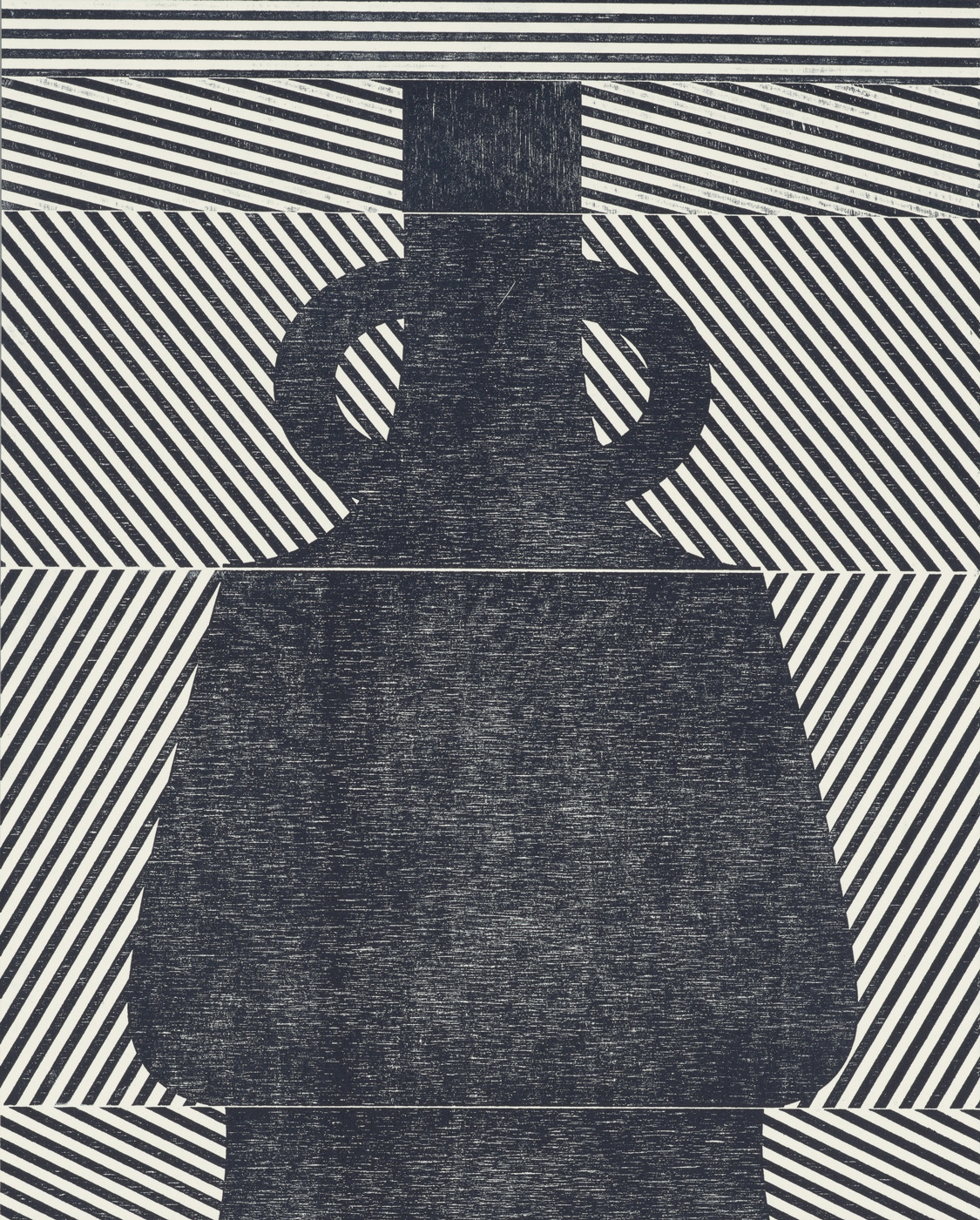 Smith’s 2025 Smokestack Analog Print Residency project, Imagined Archives, represented her introduction to relief printmaking as a new method of approach within her practice. For the making of this project, Smith created a vocabulary of graphic shapes and linear patterning fabricated into modular wood-cut pieces. Through collaborative exploration by Smith and Smokestack’s analog printmaker, Laine Groeneweg, these pieces were then rearranged into a multitude of blocked compositions to ink and pull through the press. Suggestive of a collection of vessels – or perhaps abstracted figures – each print demonstrates a unique intersection of spatial relationships, tonal densities, and playful experimentations.