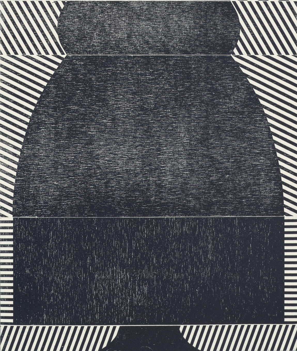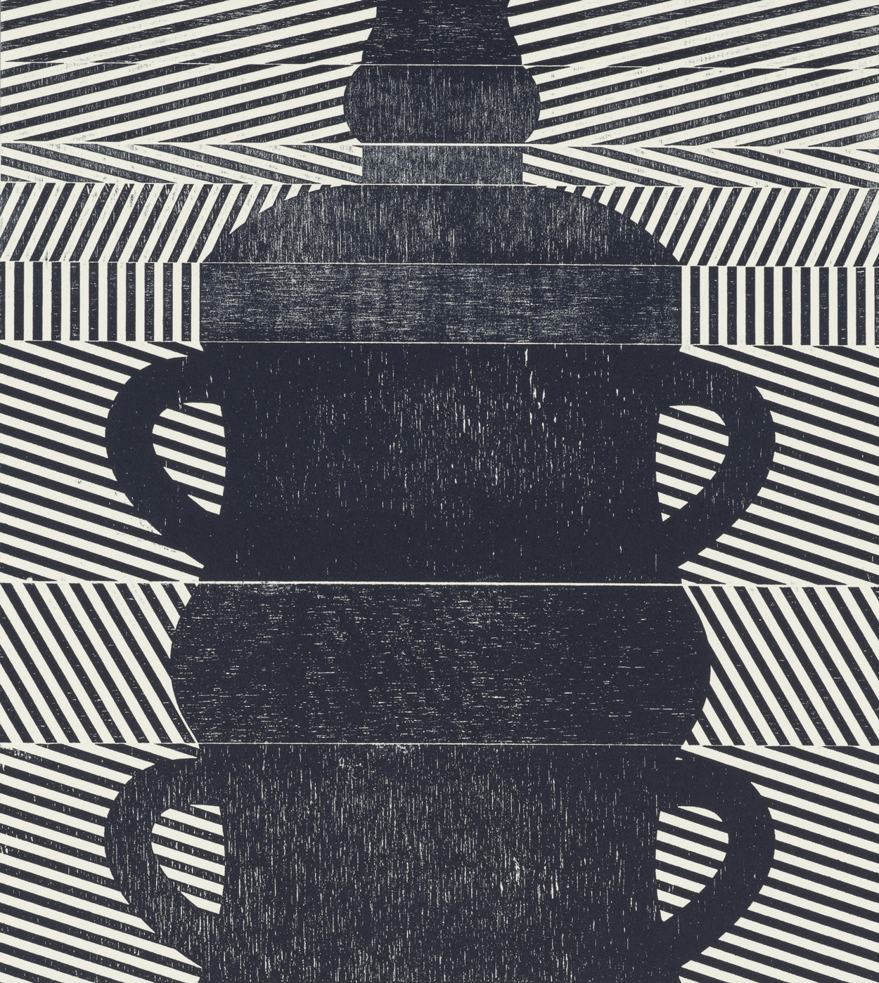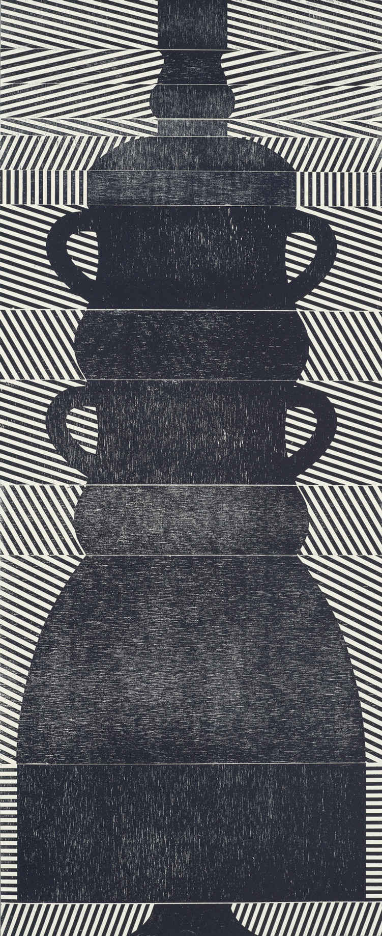 Smith’s 2025 Smokestack Analog Print Residency project, Imagined Archives, represented her introduction to relief printmaking as a new method of approach within her practice. For the making of this project, Smith created a vocabulary of graphic shapes and linear patterning fabricated into modular wood-cut pieces. Through collaborative exploration by Smith and Smokestack’s analog printmaker, Laine Groeneweg, these pieces were then rearranged into a multitude of blocked compositions to ink and pull through the press. Suggestive of a collection of vessels – or perhaps abstracted figures – each print demonstrates a unique intersection of spatial relationships, tonal densities, and playful experimentations.
