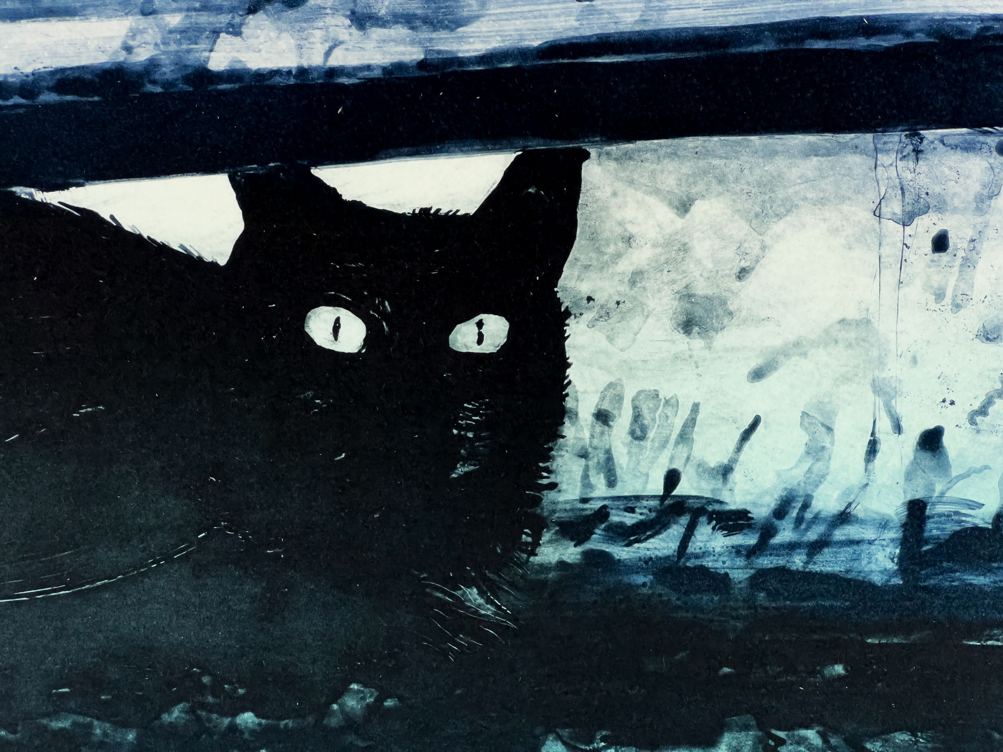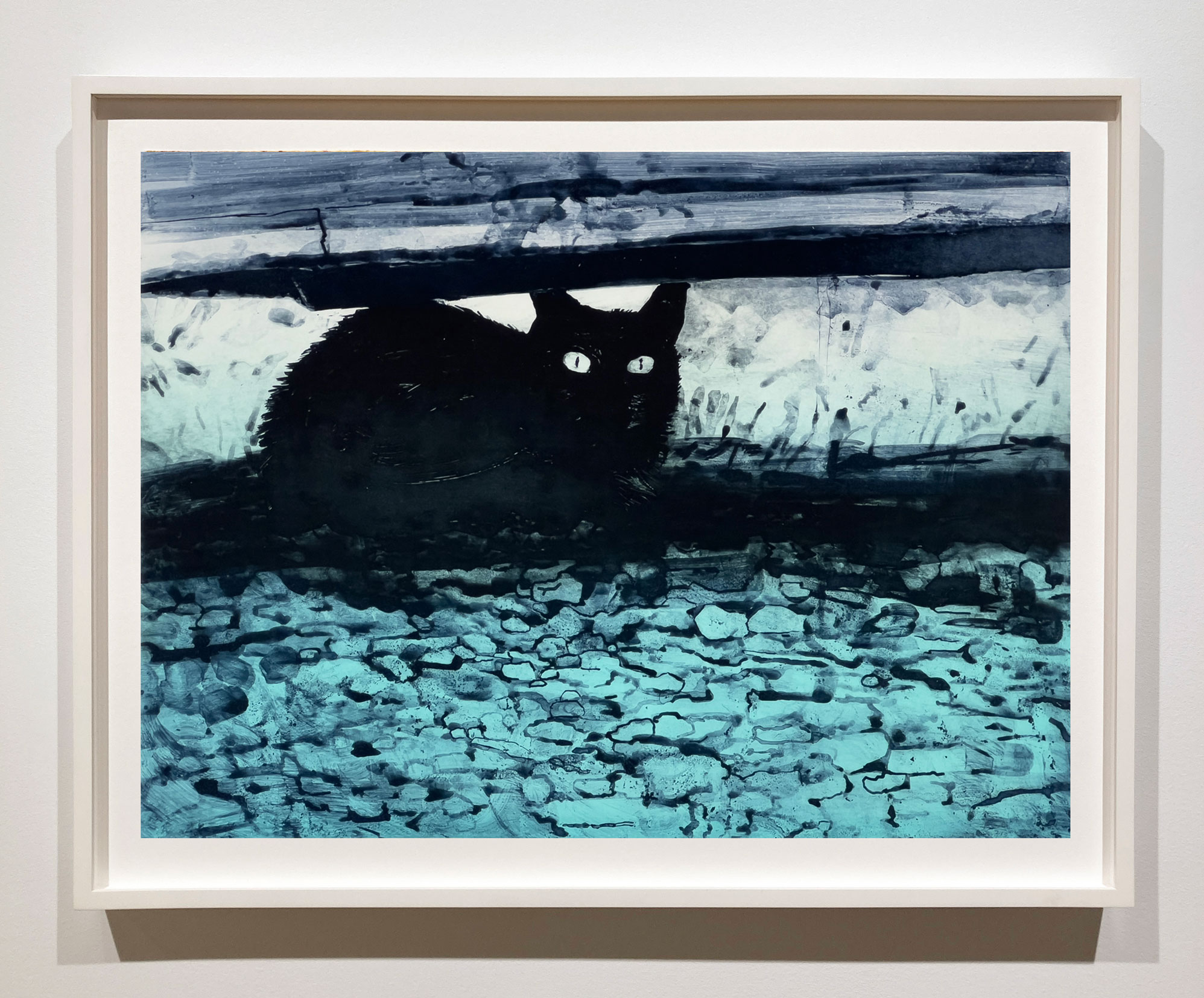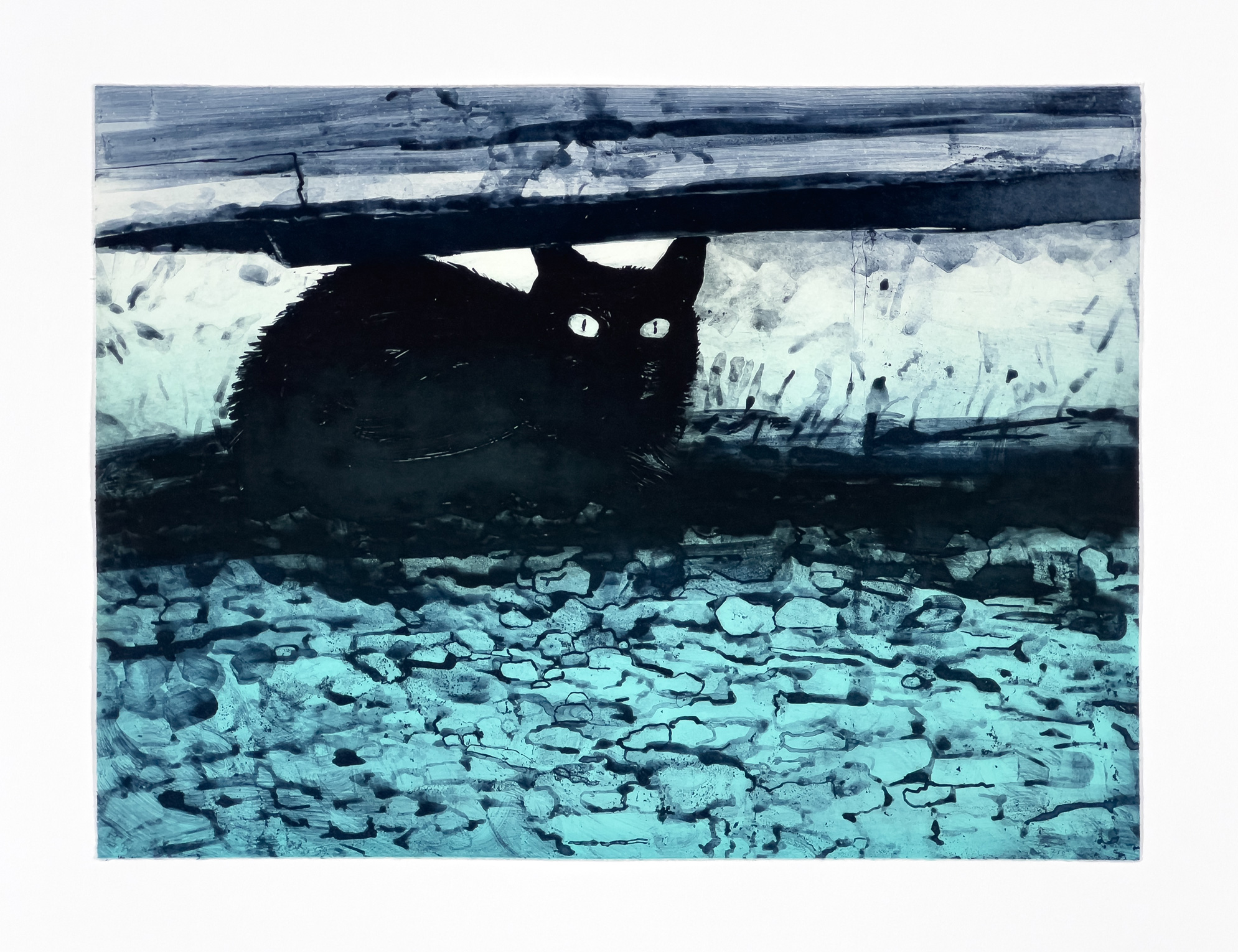 Based on a much smaller etching that Tyler created, his image making on film began with a reinterpretation of this cat. It not only gave him a familiar place to begin working with a new method of image preparation, but also allowed for new ways of mark making and material exploration.