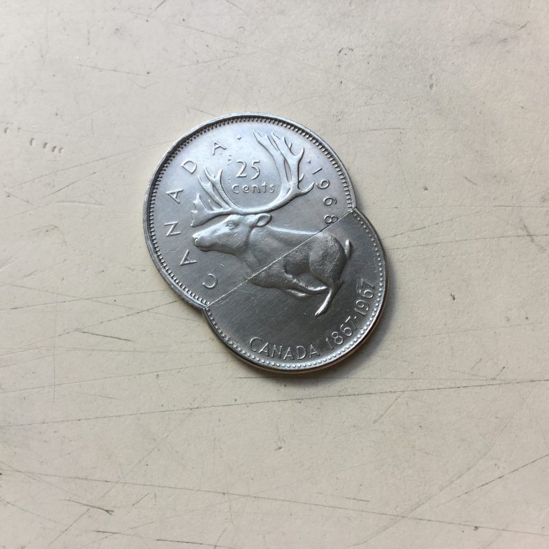 The Caribou/Hare coin collage started out as an idea/challenge; I wanted to see if the coins could be cut in such a way that the animal designs would match up, thus creating a fictional creature. I also wanted the outside edges to match up akin to overlapping circles. When the chance arose to make an etching – to scale up these coins on a copper plate and then cut them out like the originals – the proposal made for an exciting opportunity and satisfying silhouette.